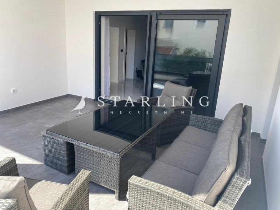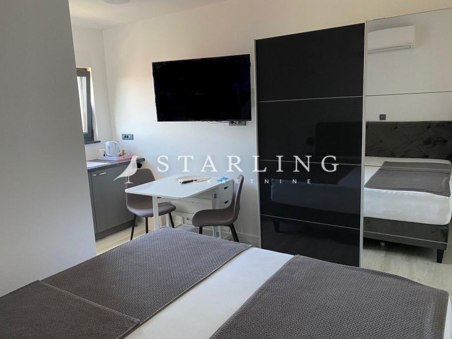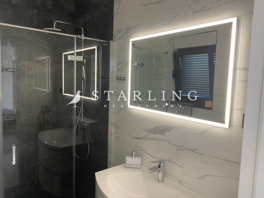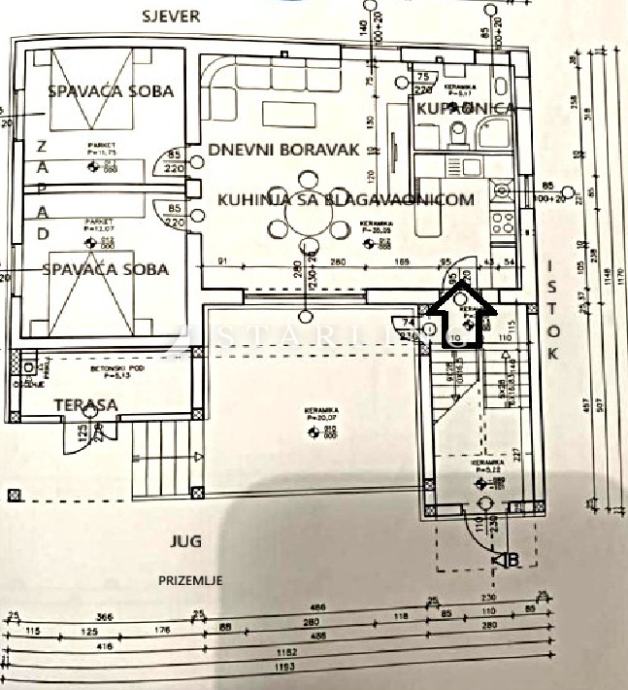 U prizemlju se nalazi apartman ukupne površine 84 m2, koji se sastoji od dnevnog boravka, kuhinje s blagovaonicom, dvije spavaće sobe, kupaonice i terase.