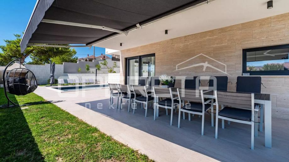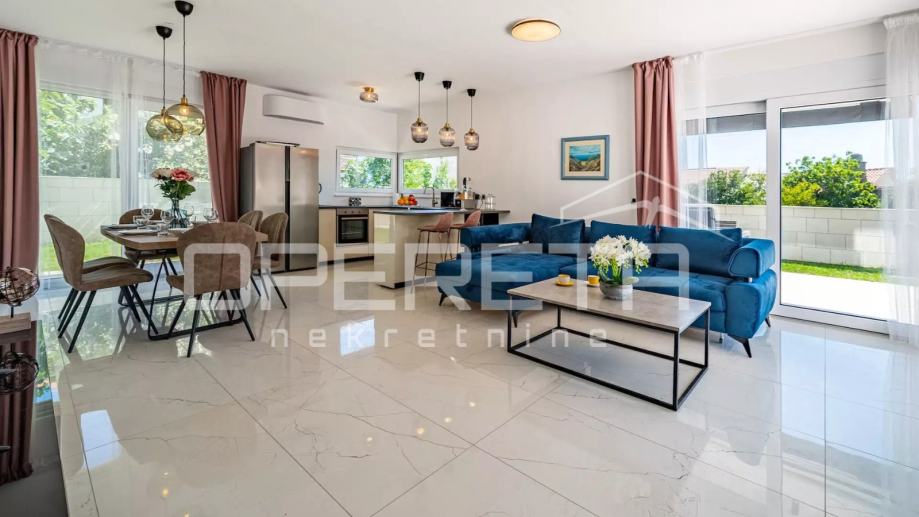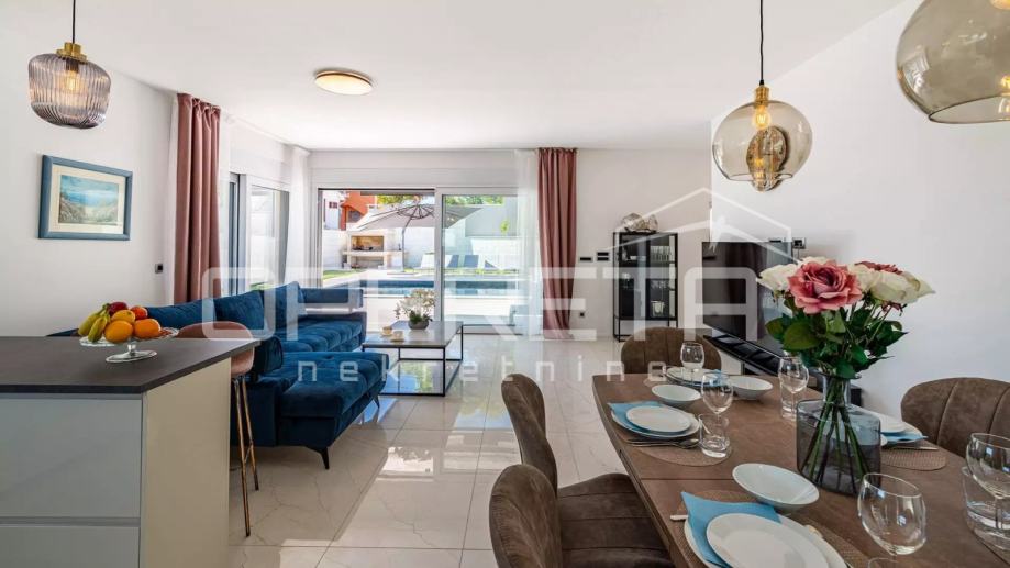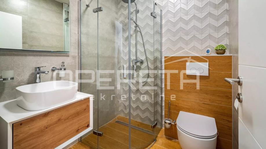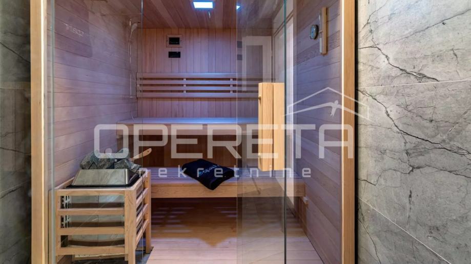 Također se sastoji od drugog, dvoetažnog stana, koji ima ukupno 4 spavaće sobe sa vlastitim kupaonicama, kuhinju spojenu sa blagovaonicom i dnevnim boravkom iz koje se može izaći na dvorišni dio gdje se nalazi predivni bazen od 28m2, veliki roštilj i zaklonjeni prostor za druženje. U prizemlju vila ima prostor za slobodno vrijeme - saunu i fitness te game room.