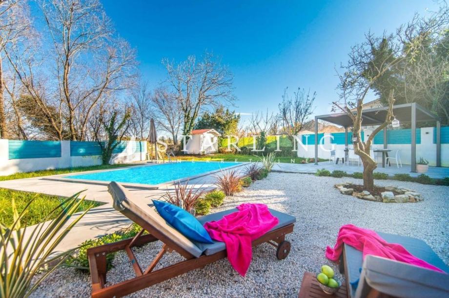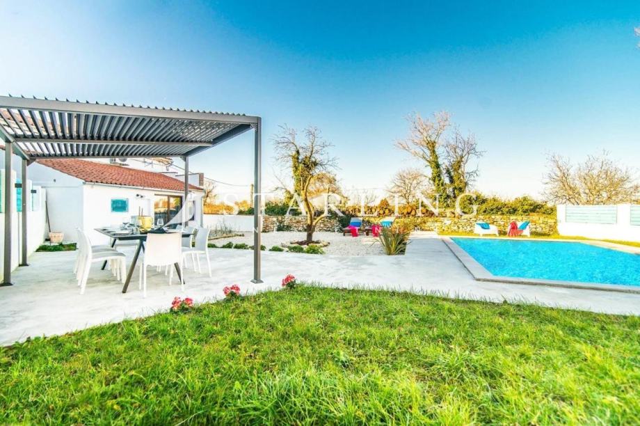 U dvorištu se nalazi bazen površine 30 m² s nadstrešnicom od 12 m², idealnim za opuštanje i uživanje na svježem zraku.
