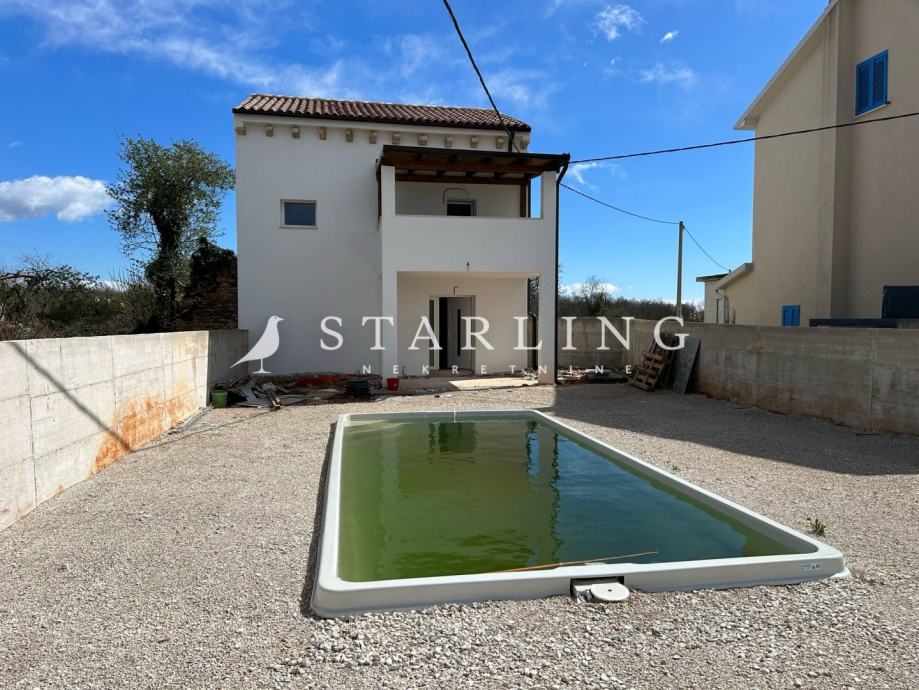 Zemljište od 412 m2, podijeljeno na kuću (tlocrtno 44m2), parkiralište i dvorište s bazenom dimenzija 7 x 4 m.
