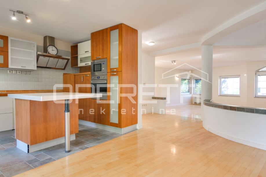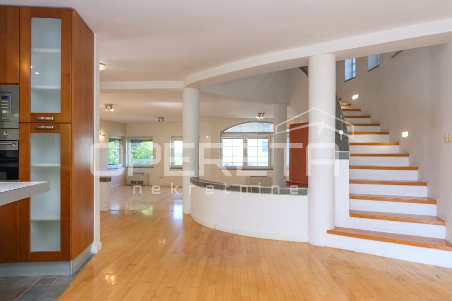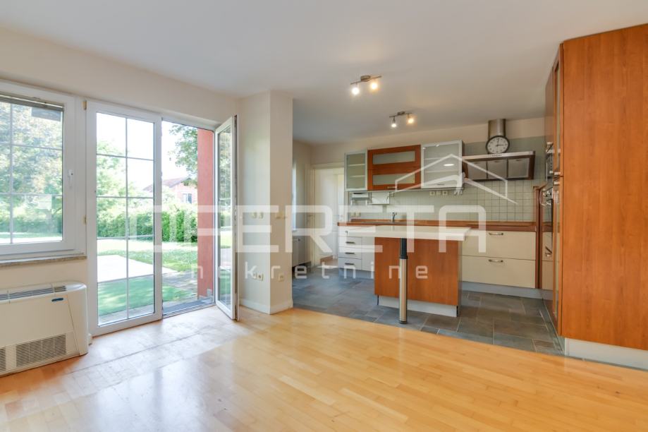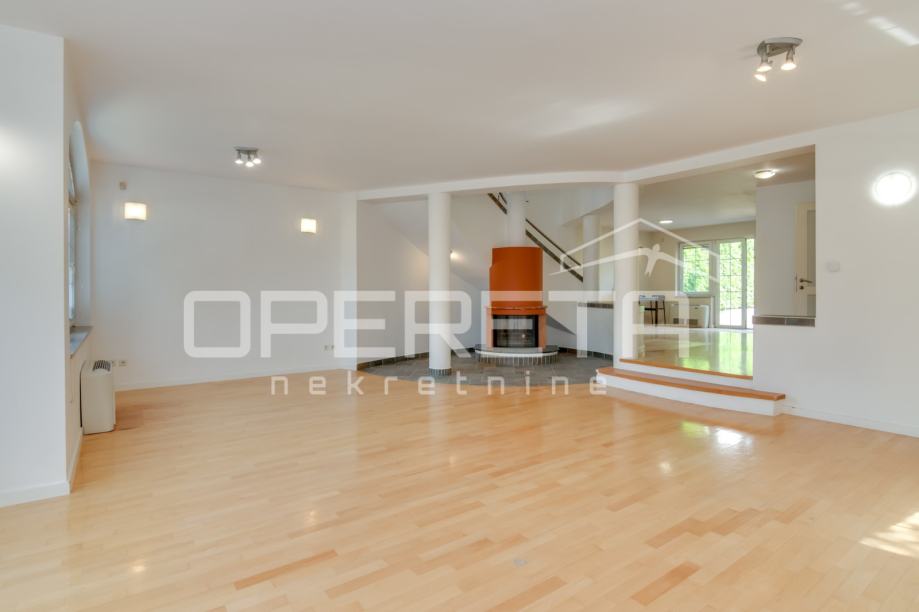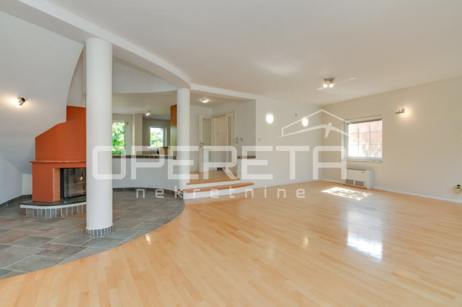 Koncipirana je kao veliki open space s deniveliranom dnevnom sobom s kaminom, a iz kuhinjskog dijela je izlaz u predivan vrt koji je zaštićen od pogleda.