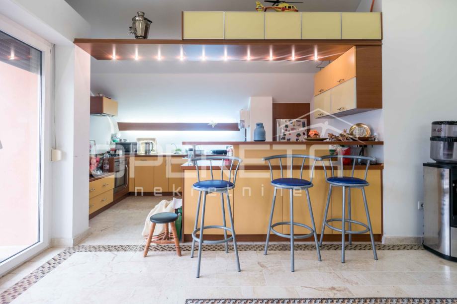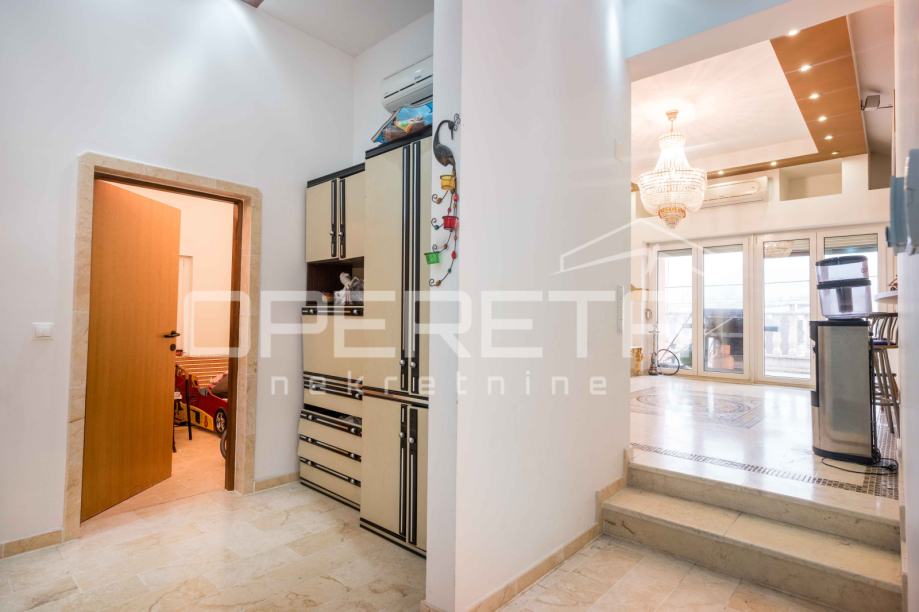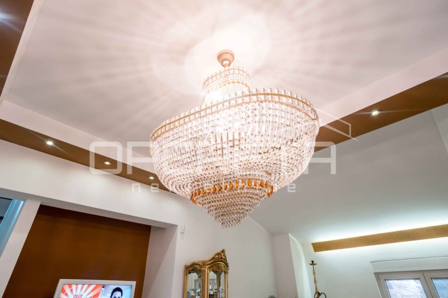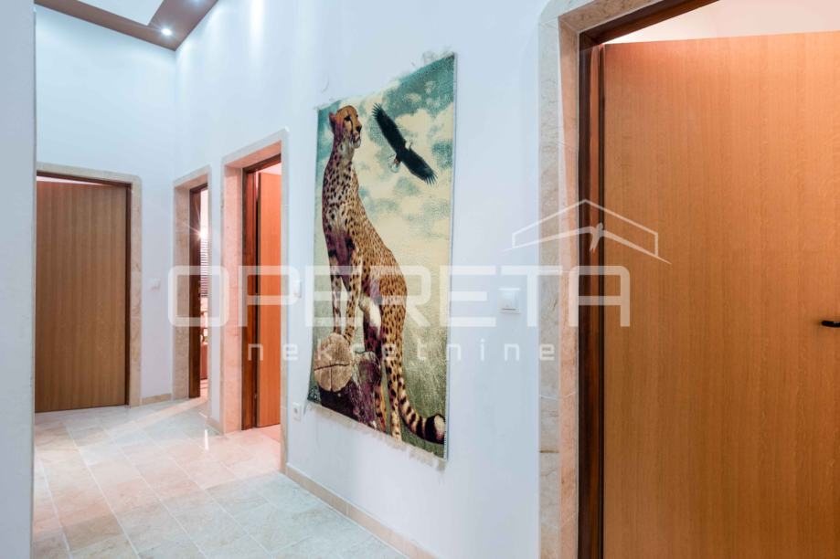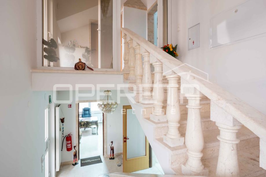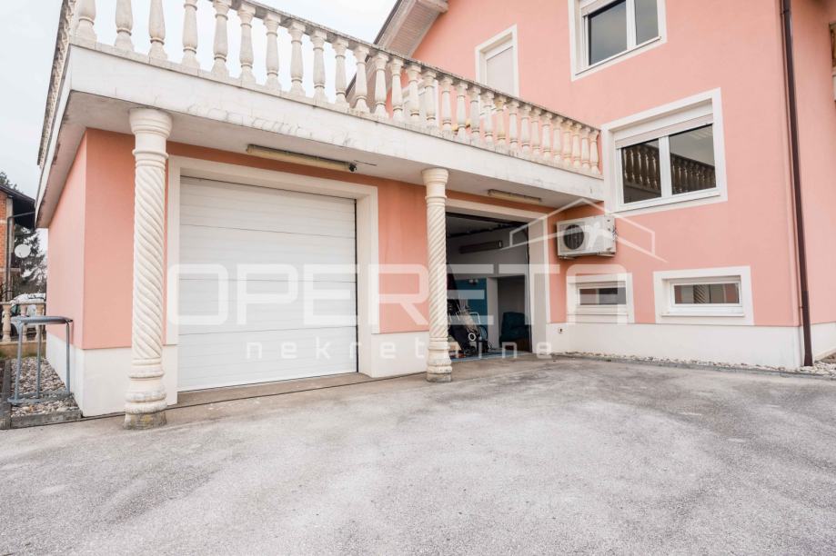 Svaka etaža ima svoju zasebnu strujnu kutiju. Prizemna etaža (175m2) se sastoji od 4 moguća ulaza/izlaza, veliki ulazni prostor sa recepcijom, 2 velika ureda, prostor za izlog, vanjske i unutarnje stepenice. Gornja etaža (144m2) se sastoji od predivno uređenog dnevnog boravka sa izlazom na terasu, kuhinjom i blagovaonicom te pripremom za veliki kamin, čak 4 komotne spavaće sobe, kupaonice sa wc-om, dodatnog wc-a i dodatne terase. Gornja etaža je zamišljena za osobnu upotrebu dok je prizemna i donja etaža zamišljena za uredske prostore. Cijeli vanjski prostor je opremljen detektorima pokreta, rasvjetom, kamerama i strujom. Ulaz u garaže se nalazi sa stražnje strane kuće dok u prednjem djelu postoji vanjski parking za više automobila uz mogućnost natkrivanja parkinga. U nastavku dolazimo do prostora za uživanje i roštilj gdje se prostire zelena površina do kraja parcele.