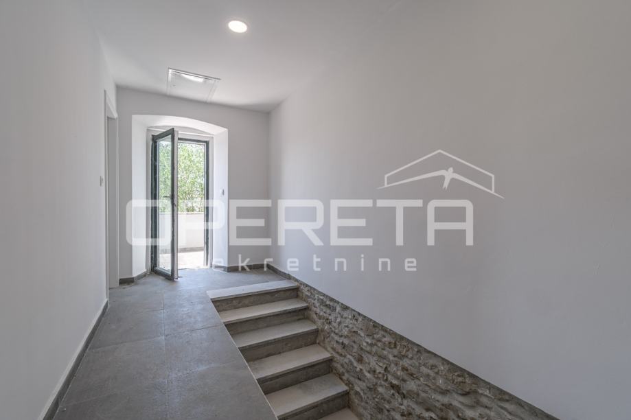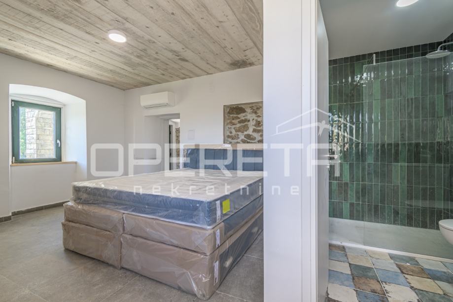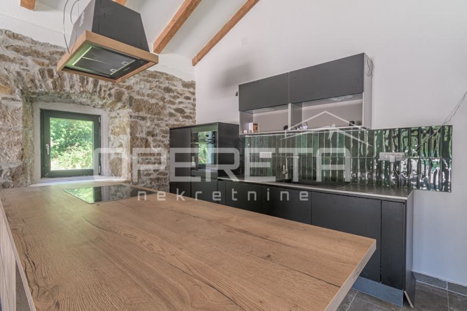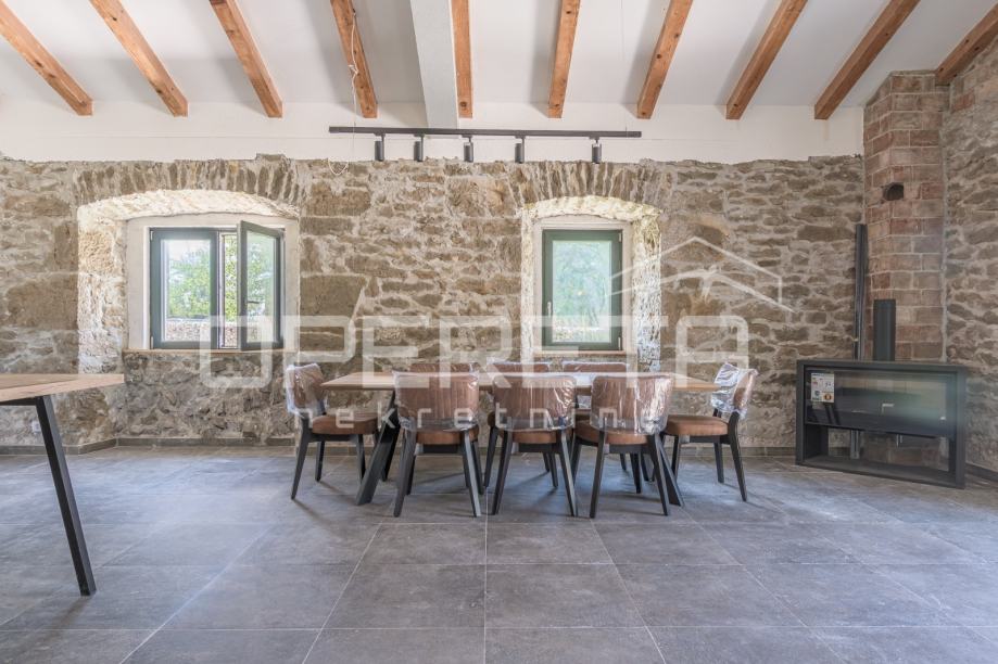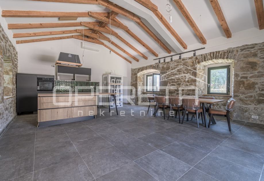 Unutrašnjost kuće organizirana je na dvije funkcionalne etaže; Prizemlje dočekuje s ulaznim prostorom i praktičnim spremištem ispod stepenica, hodnikom, gostinjskim toaletom i jednom udobnom spavaćom sobom s vlastitom kupaonicom. Centralni dio prizemlja čini prostrani dnevni boravak s kuhinjom i blagovaonicom površine gotovo 50 m². Velika staklena stijena omogućuje nesmetan pogled na okućnicu iz gotovo svakog kuta prostorije, donoseći prirodnu svjetlost i pejzaž unutra. Tradicionalni kamen, visoki stropovi, dekorativne grede i ugodan kamin dodatno naglašavaju toplinu i autentičan karakter ovog prostora.