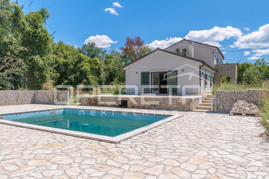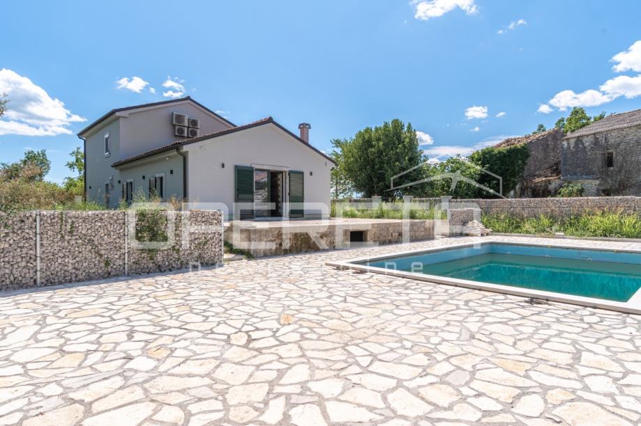 Uređena okućnica stvara idilično okruženje za opuštanje i zabavu. Ovdje se nalazi bazen s prostranim sunčalištem, idealan za uživanje u toplim danima. Za ljubitelje druženja na otvorenom, tu je i vanjska kuhinja s roštiljem, prostrana zelena površina te tri osigurana parkirna mjesta.
