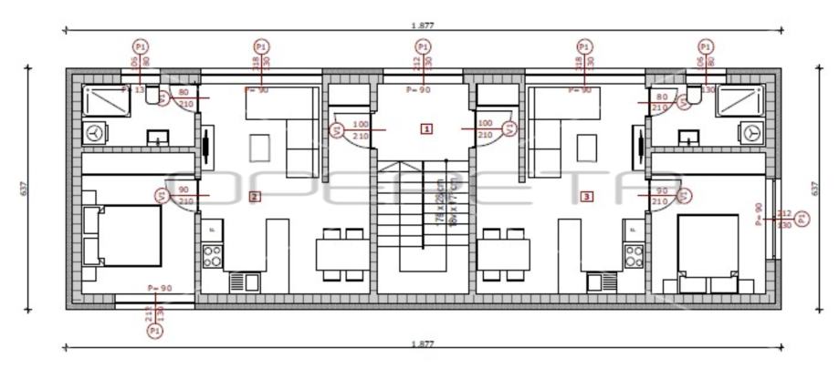 Idejni projekt obuhvaća poslovni prostor u prizemlju površine 40,84 m2 kao i dva manja dvosobna stana od 40,53 m2. Za svaki stan je zamišljena i galerija u potkrovlju koja će dodatno doprinijeti većem dojmu stanova. Predviđeno je 5 parkirališnih mjesta.