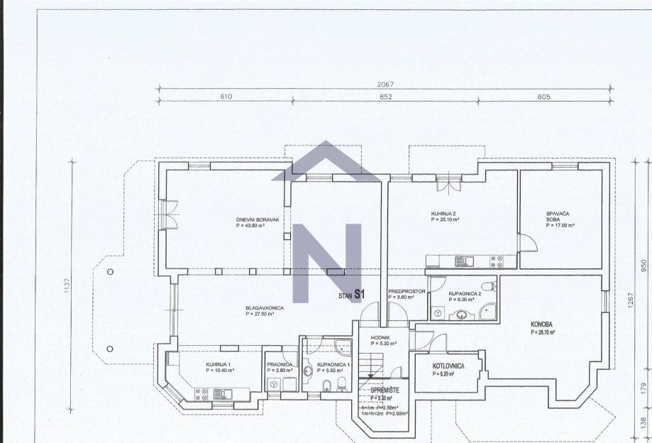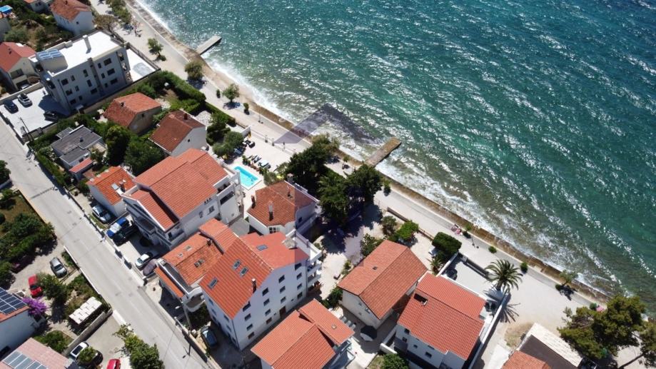 Kuća se sastoji od 8 uređenih i useljivih apartmana raspoređenih kroz 4 etaže. Na svakoj etaži nalaze se po 2 apartmana (prikazano na tlocrtima u oglasu).