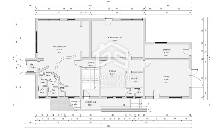 Kuća je ukupne bruto površine cca 850 m², dok neto stambeno-poslovna površina iznosi cca 650 m². Sastoji se od četiri stambene jedinice, dva poslovna prostora, garaže, spremišta te uređenog dvorišta površine 339 m², koje pruža dodatni vanjski prostor za razne potrebe – bilo privatne, bilo poslovne.