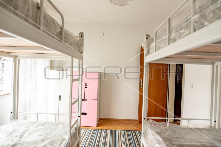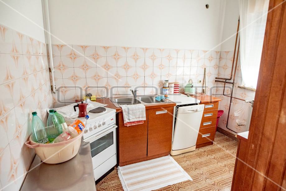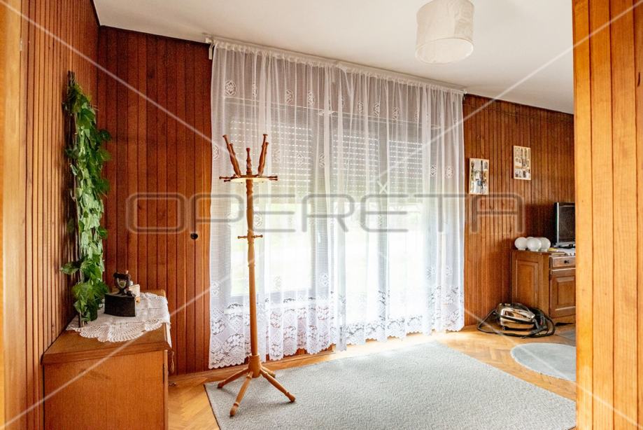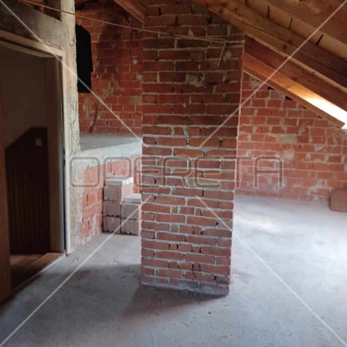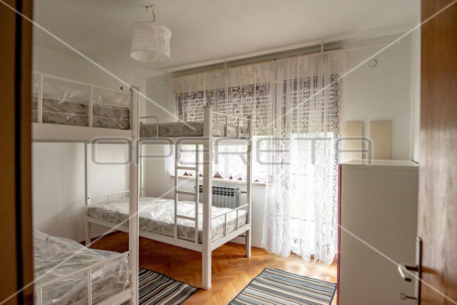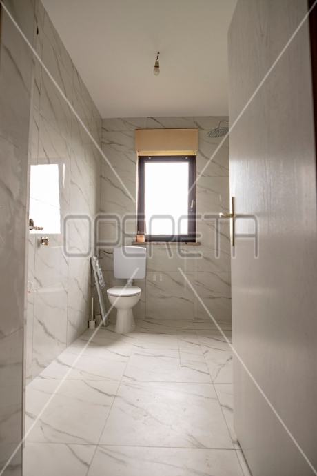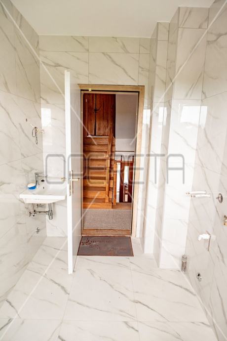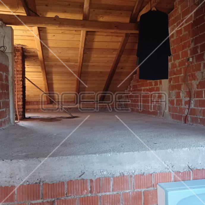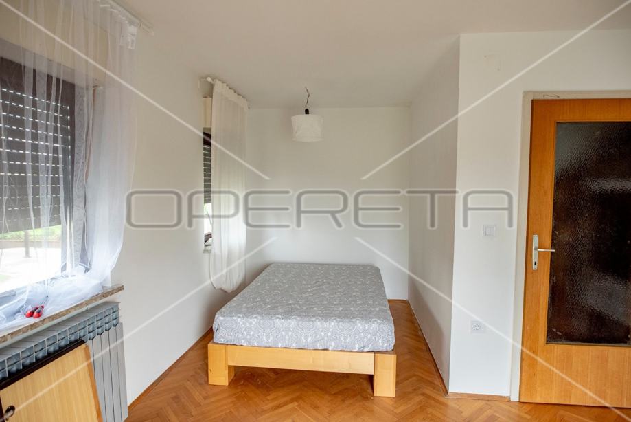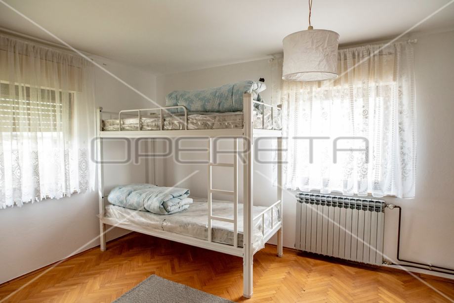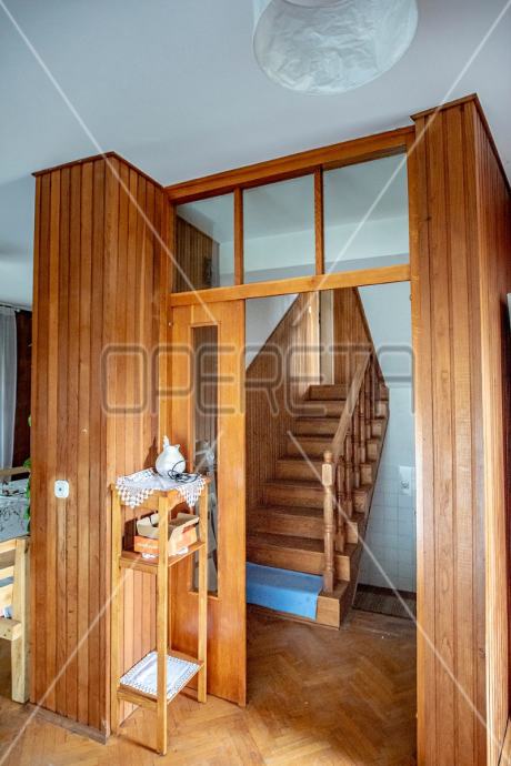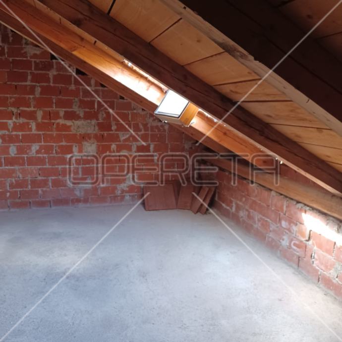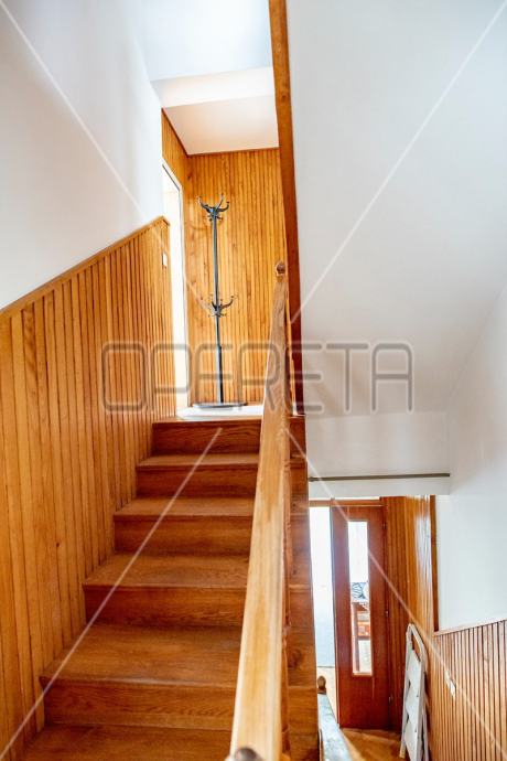 Samostojeća kuća na tri etaže, na mirnoj lokaciji, uređena za najam. Sastoji se od prizemlja u kojem je dnevni boravak s blagovaonicom, kuhinja i stepenište na polukat gdje su dvije velike sobe i kupaonica s wc-om. Na sljedećem polukatu su još dvije sobe sličnih veličina i iznad je roh bau tavan od 80m2 tlocrtno. U suterenu je garaža od 30m2, a iza kuće je pomoćna kućica od isto 30m2. Vrlo prostrana kuća dobrog rasporeda, novih instalacija, kupaonice i bojlera za centralno plinsko grijanje. Useljiva odmah. Prlika!