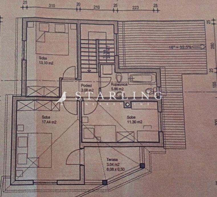 Na prvom katu se nalaze dvije spavaće sobe od kojih glavna spavaća ima svoj balkon te kuhinja, kupaona i spremište. Gornja etaža se može koristiti kao zasebna jedinica ili se mogu napraviti tri spavaće sobe pa kuća može imati komotne četiri spavaće sobe.