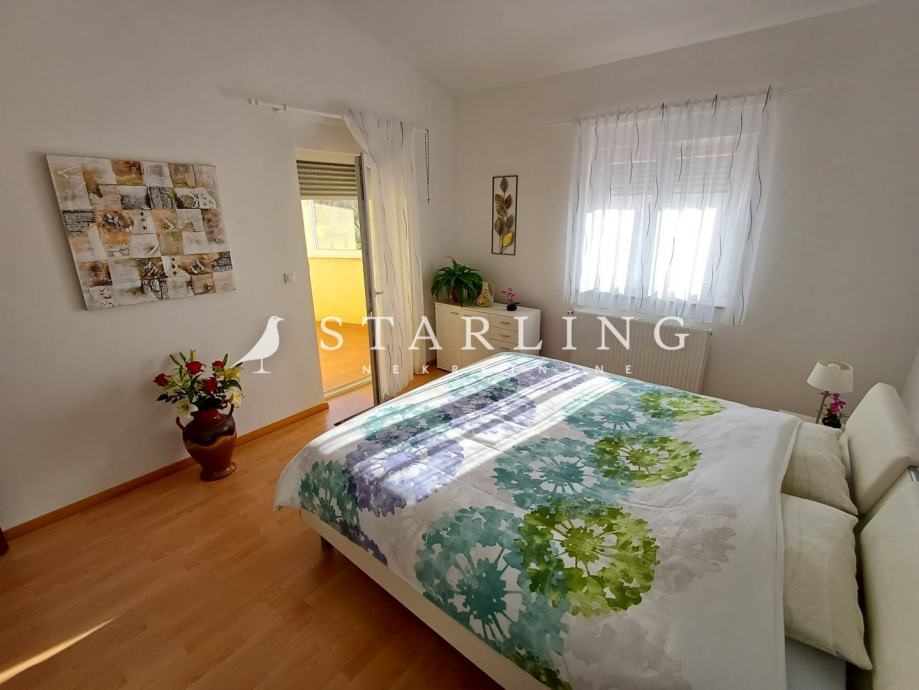 Na prvom katu se nalaze dvije spavaće sobe od kojih glavna spavaća ima svoj balkon te kuhinja, kupaona i spremište. Gornja etaža se može koristiti kao zasebna jedinica ili se mogu napraviti tri spavaće sobe pa kuća može imati komotne četiri spavaće sobe.