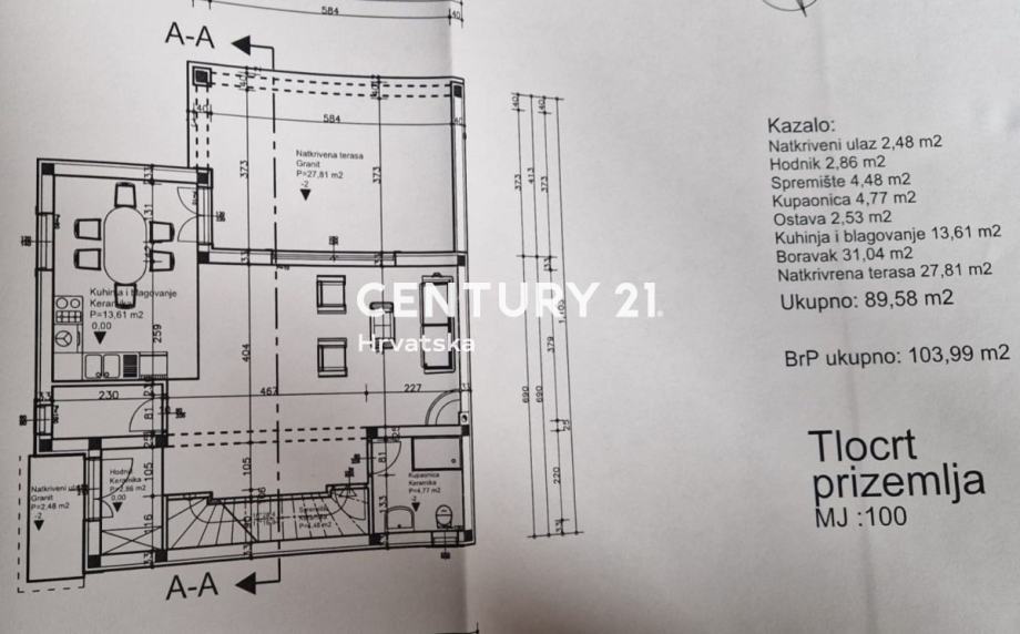 Kuća se sastoji od ulaznog hodnika, kuhinje sa blagavaonom, dnevnog boravka, kupaonice, tehničke sobe i zatvorenog prostora ispod stepeništa koje može poslužiti kao ostava i slično.