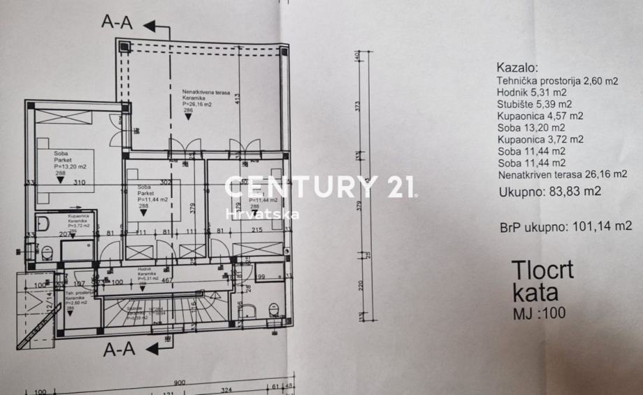Unutarnjim stepeništem penjemo se na prvi kat na kojem se nalazi hodnik/komunikacija, tri spavaće sobe svaka sa izlaskom na prostranu i osunčanu terasu, dvije kupaonice, tehnička soba.