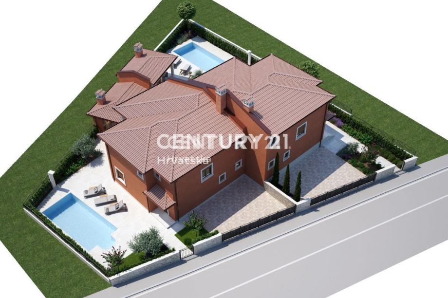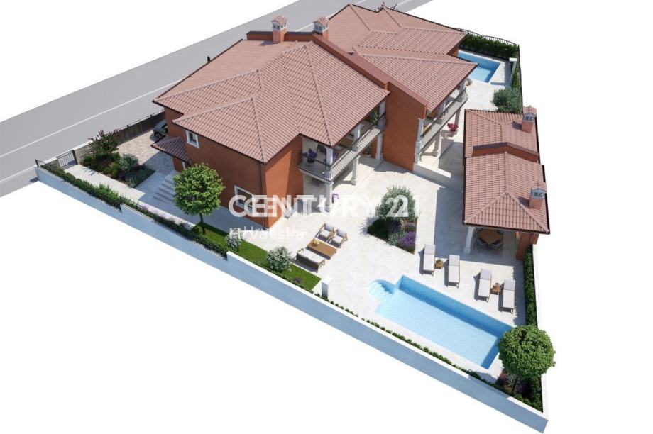 Dvorište je uređeno, formirano i na njemu se nalazi bazen sa sunčalištem i plažom na kojem je položen rustikalni istarski kamen, ljetna kuhinja/taverna natkrivena površine 22 m2 sa wc-om i tušem.