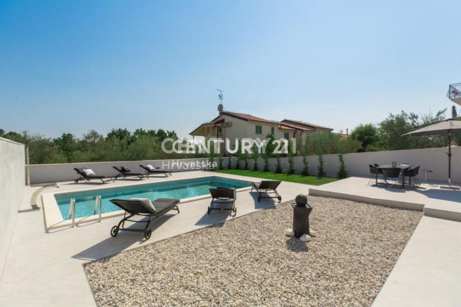 U uređenoj okućnici nalazi se bazen, sunčalište, te travnjak s navodnjavanjem.