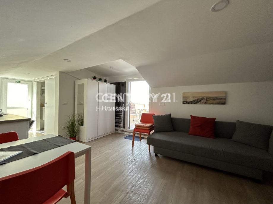 Stanu mansardi površine 30 m2 sastji se od ulaznog hodnika, kuhinje sa dnevnim boravkom i spavaćim dijelo otvorenog tipa, kupaonice i terase sa spektakularnim pogledom na more, Talijanske alpe i Slovensku obalu.