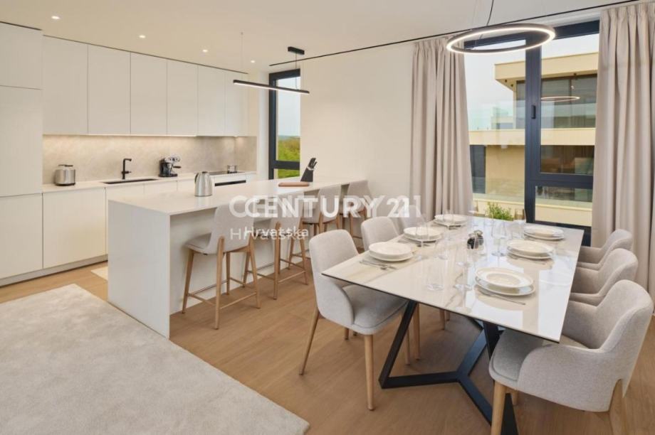 Prizemlje se sastoji od dvije spavaće sobe s en suite kupaonicama i pristupom na balkon te spremišta, dok se prvi kat sastoji od prostranog dnevnog boravka s izlazom na djelomično natkrivenu terasu površine 46m2, kuhinje s blagovaonicom te dodatnog toaleta.