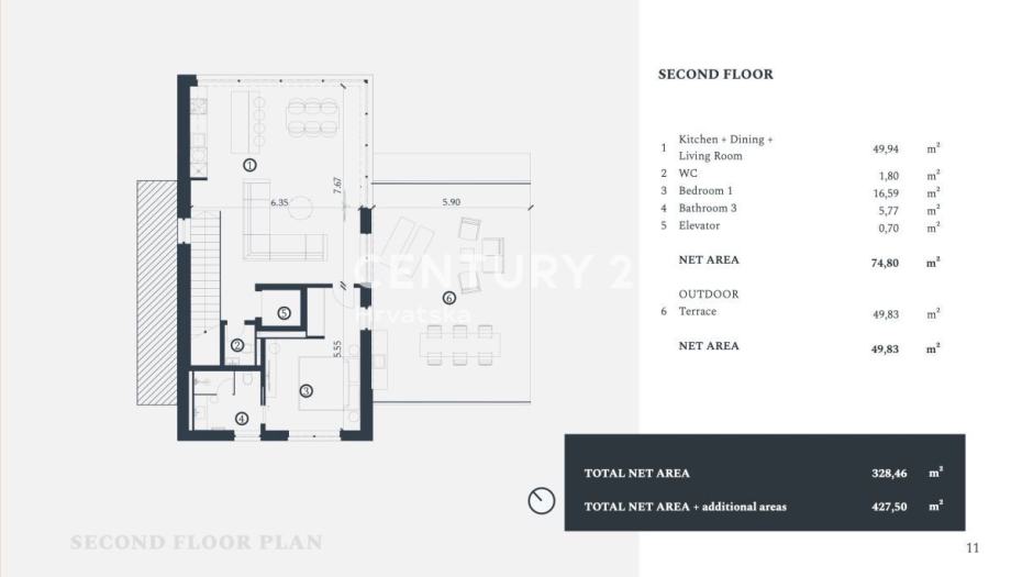 Na drugom katu nalaze se veliki dnevni boravak s kuhinjom i izlazom na terasu površine 49m2, wc, te još jedna spavaća soba s kupaonicom.