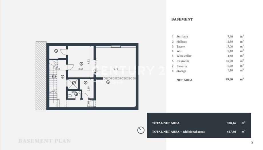 U podrumu kuće nalazi se velika soba, konoba s vinskim podrumom, wc, te spremište.