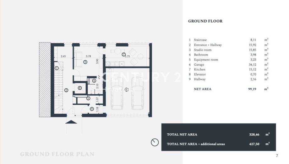 Prizemlje se sastoji od dnevnog boravka s kupaonicom i odvojenom kuhinjom, te može funkcionirati kao samostalan studio apartman. U prizemlju je još i garaža s mjestom za 2 automobila, te spremište.