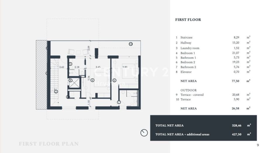 Prvi kat sastoji se od dvije spavaće sobe s en suite kupaonicama i pristupom na balkon te spremišta.