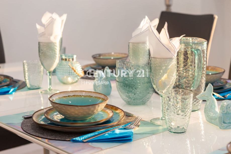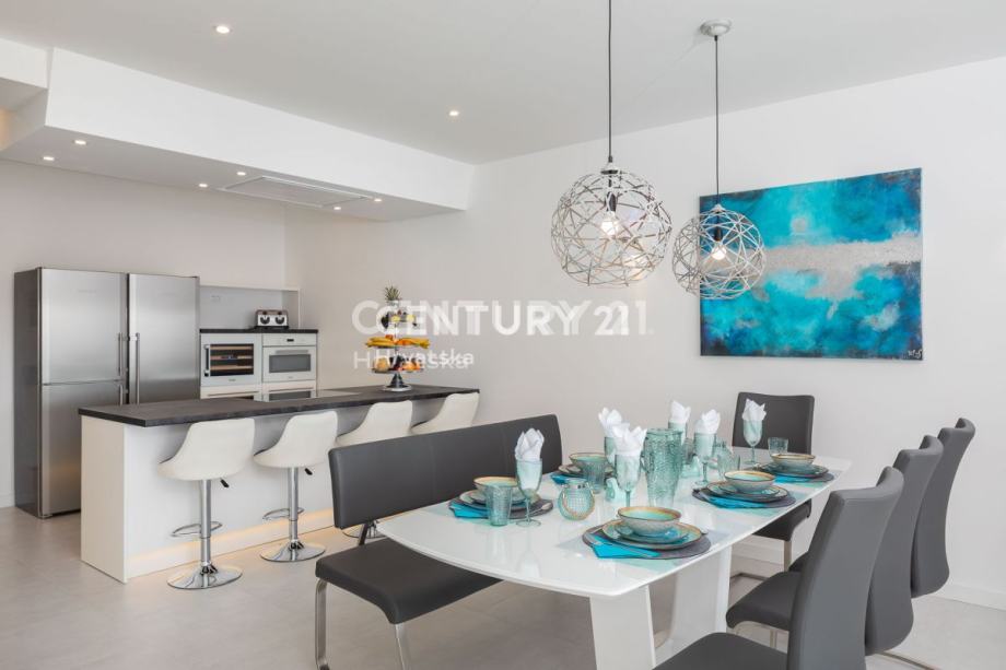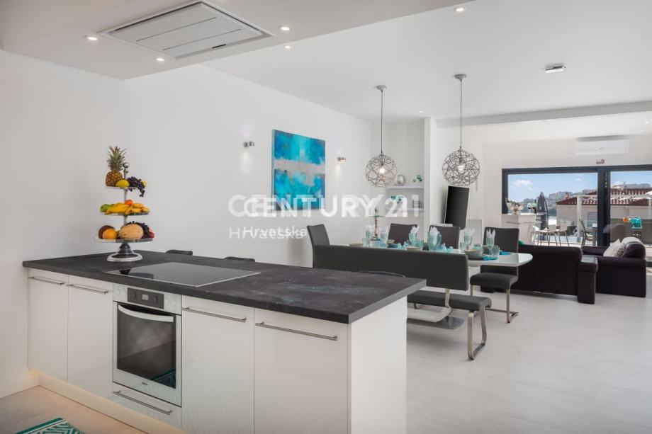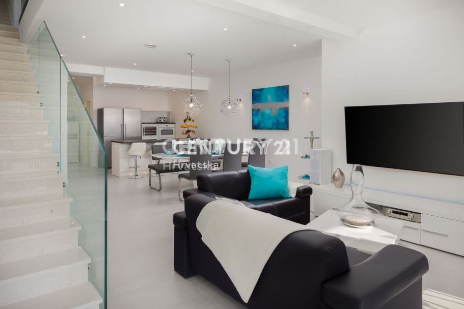 S terase se ulazi u dnevni dio otvorenog koncepta. Sastoji se od dnevnog boravka i potpuno opremljene kuhinje. Ovaj je prostor idealan ako se tijekom dana želite skloniti od iscrpljujuće vrućine. Dnevni boravak ima dva udobna dvosjeda te mali bar u kojem si možete pripremiti piće i uživati u omiljenoj TV emisiji ili slušati omiljenu glazbu na kućnom Marantz prijemniku.
