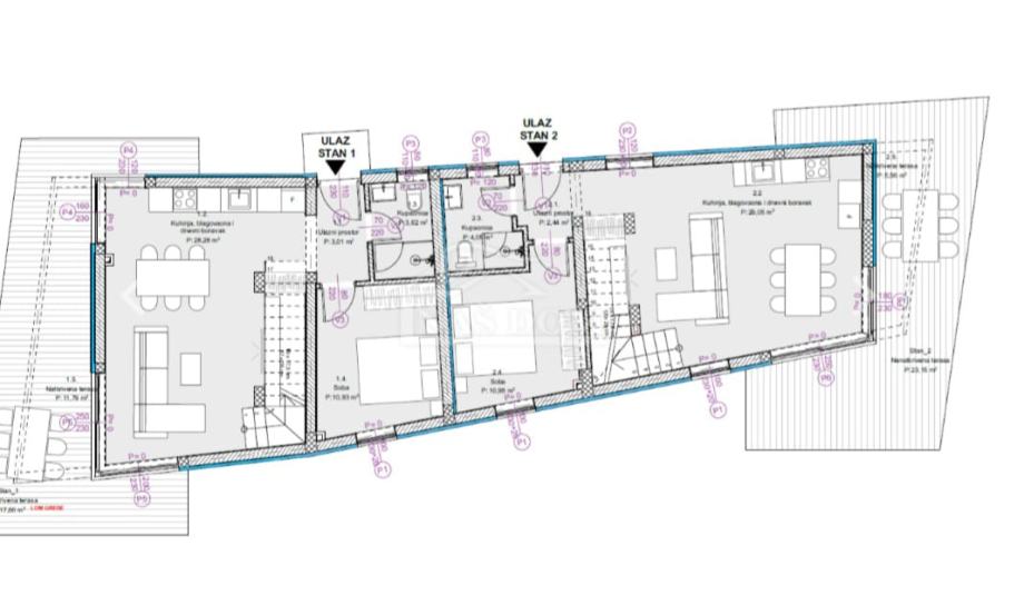 S1 ima ukupnu površinu od 111,4 m2 i prostire se na dvije etaže. U prizemlju se nalazi kuhinja sa blagavaonom i dnevnim boravkom, spavaća soba sa kupaonom i terasa od 11,79 m2. Na katu se nalazi prostrani balkon, dvije spavaće sobe i svaka soba ima svoju kupaonu i jednu garderobu. Kući pripada jedno parkirno mjesto i vrt od 115 m2. Ova kuća će biti izgrađena modernim materijalima i opremljena prema najnovijim standardima gradnje. Početak izgradnje 01.10.2024 a završetak u ljeto 2025. godine.