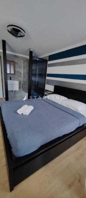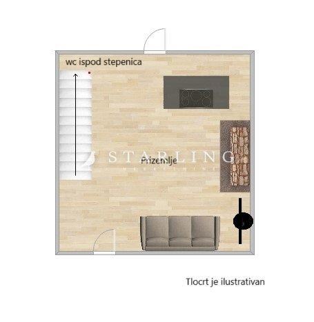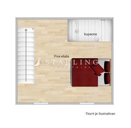 Na prvoj etaži se nalazi spavaća soba s kupaonicom dok se na zadnjoj etaži nalazi prostor koji se može koristiti kao dodatna spavaća soba ili spremište.