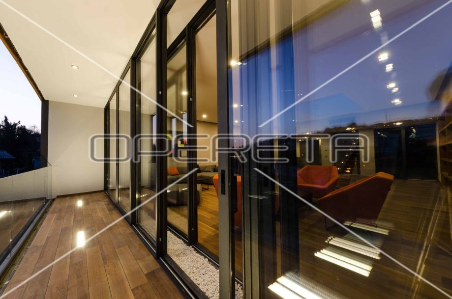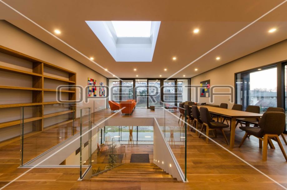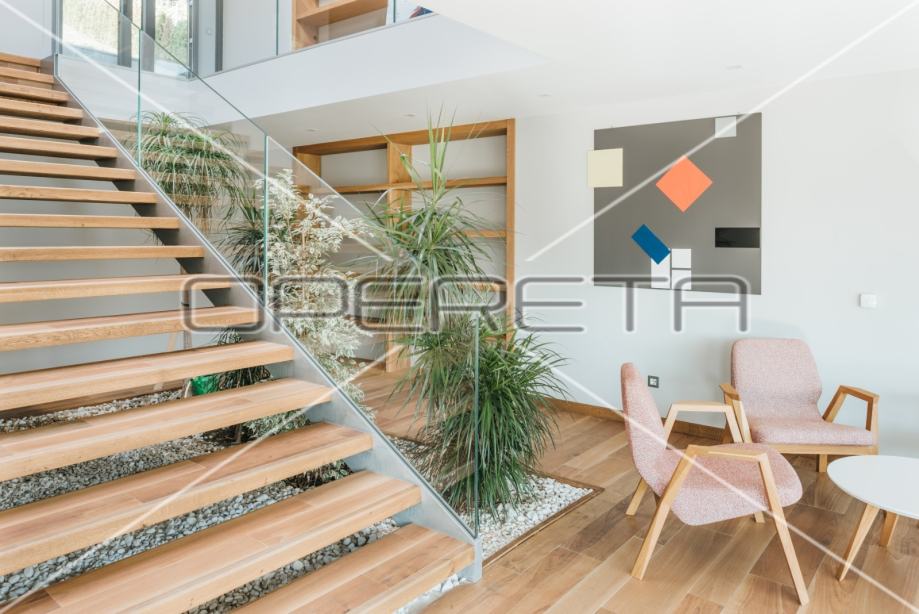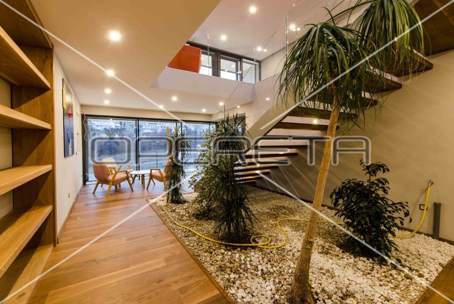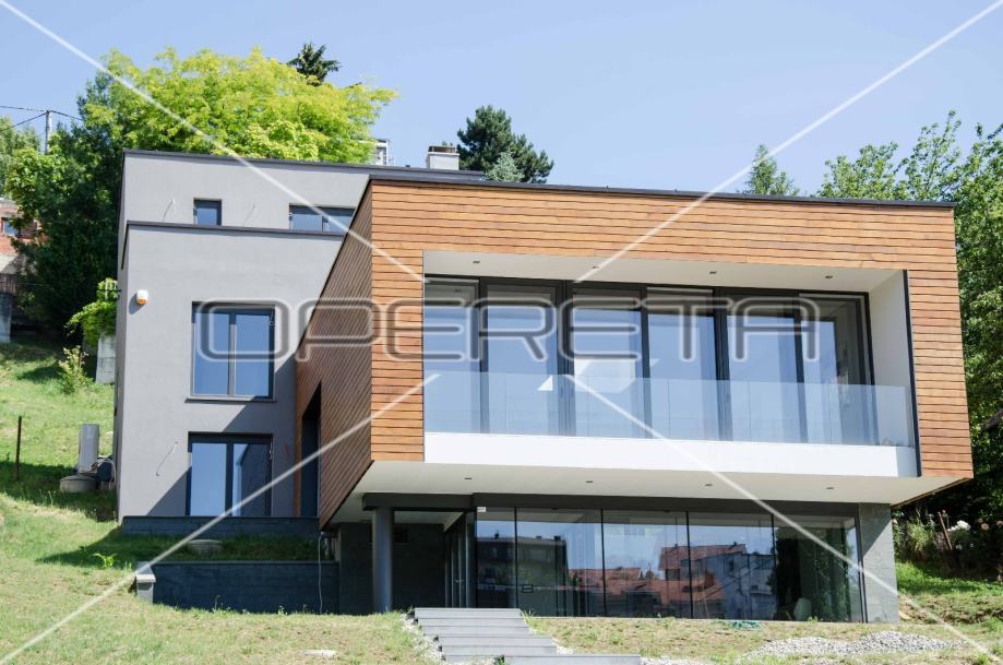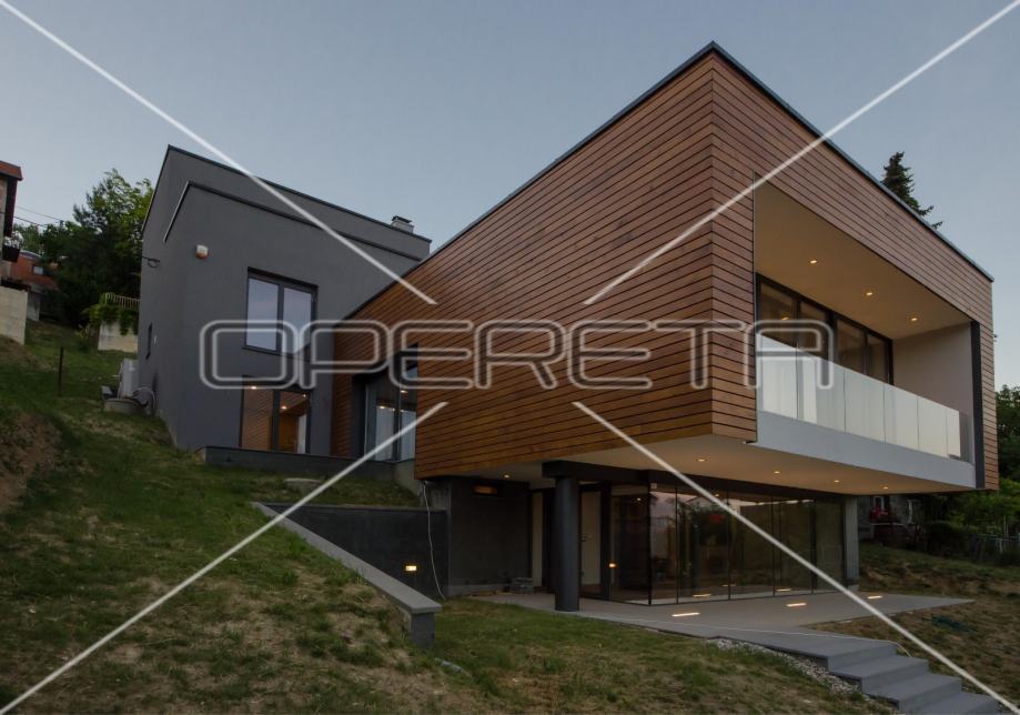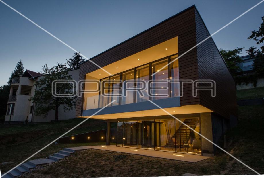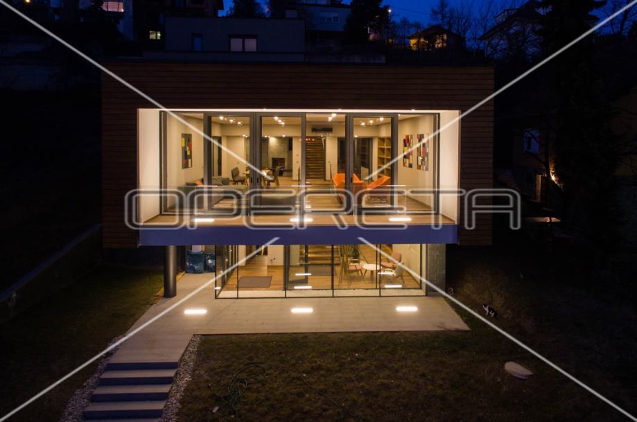 Ova moderna urbana obiteljska kuća za prodaju smjestila se u Podsljemenskoj zoni, u Gračanima, u neposrednoj blizini žičare za Sljeme i šoping centra Meridijan. Lokacija se nalazi nedaleko od svih gradskih zbivanja, a ipak je zaklonjena od gradske vreve, idealna za odmor i obiteljsko druženje nakon napornog radnog dana. Parcela se nalazi na južnoj padini Medvednice, površine je cca 1100 m2 i omogućila je izgradnju obiteljske kuće koja se prostire na cca 430 m2 s velikim dvorištem. Projektanti su uložili veliki trud kako bi se korisniku omogućilo komforno korištenje kuće u pogledu dimenzioniranja prostorija, kvalitete primijenjenih materijala i korištene tehnologije u kući. Kuća je moderno oblikovana s nizom volumena koji se kaskadno spuštaju prema jugu prateći nagib terena. Pozicija kuće definirana je uvučeno u odnosu na liniju pristupne ulice kako bi se eliminirala buka prometa i sačuvala privatnost korištenja unutarnjih prostorija i pratećih vanjskih terasa koje se usijecaju u padinu parcele i maksimalno prožimlju s prirodnim okolišem. Ulična linija definirana je modernom ogradom obrađenom u kamenu s garažom ukopanom u padinu brda povezanom s kućom otvorenim majstorski izvedenim stubištem popločenim kamenom.
