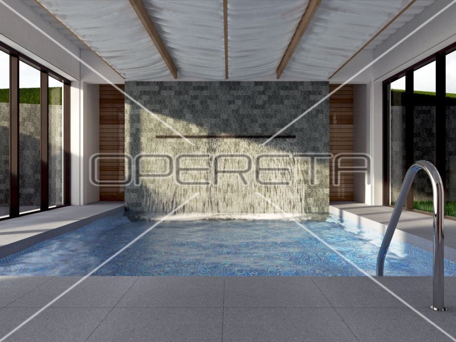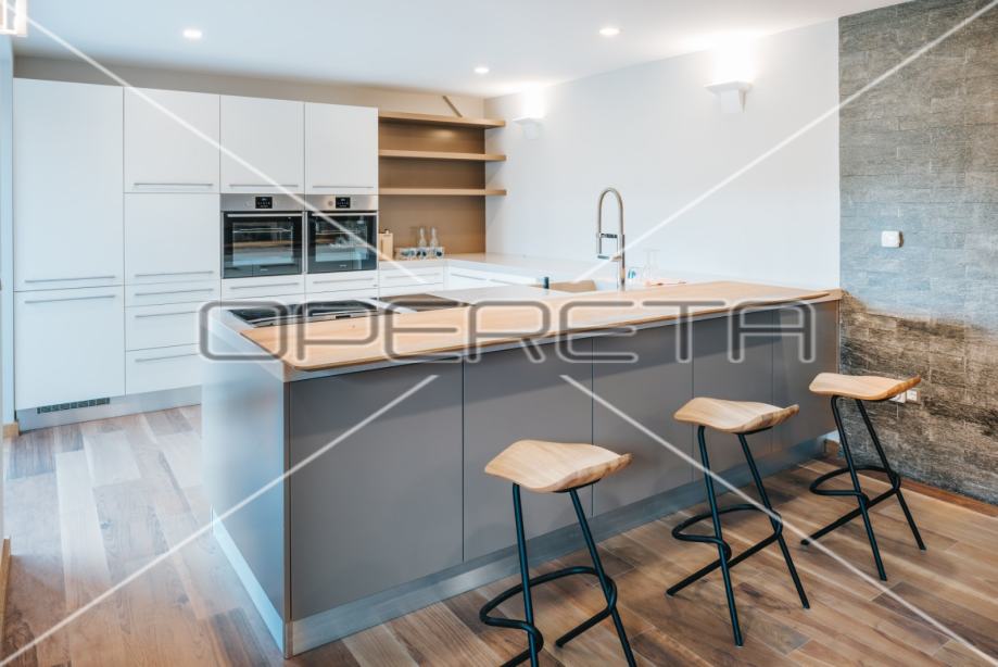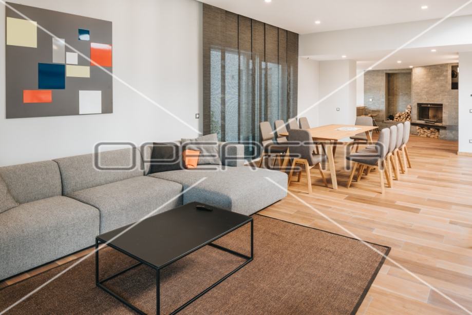 U oblikovanju interijera korišteni su kvalitetni materijali – podovi su popločeni kvalitetnom španjolskom keramikom, a u zidne niše ugrađene su ručno rađene hrastove police. Poseban naglasak u interijeru je veliki kutni kamin smješten u nastavku kuhinje obložen talijanskim kamenom.