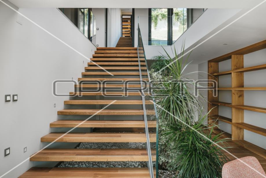 Kuća je koncipirana od 4 etaže koje se međusobno izmiču i kaskadno spuštaju prema jugu otvarajući se prema osunčanju južne padine i pogledu na ulicu i susjedni obronak. Funkcionalna organizacija kuće jednostavna je s ulaznim prostorom u suterenu, prostranim dnevnim boravkom i kuhinjom u prizemlju, 3 spavaonice sa zajedničkom kupaonicom te prostorom bazena i wellnessa na 1. katu te glavnom spavaonicom s vlastitom kupaonicom i garderobama na 2. katu. Kući se pristupa u suterenu kroz ostakljeni vjetrobran u donju zonu dnevnog boravka s posebnim akcentom – pošljunčanim unutarnjim vrtom natkrivenim svjetlosnom kupolom i zazelenjenim visokim zelenilom uz kojeg se uspinje moderno lagano čelično stubište u prostranu gornju zonu dnevnog boravka, blagovaonice i kuhinje namještenim atraktivnim dizajnerskim namještajem domaćeg branda Prostoria.