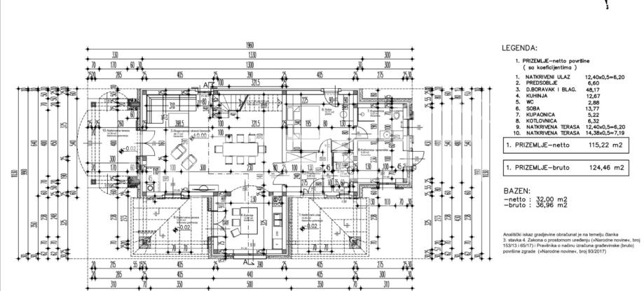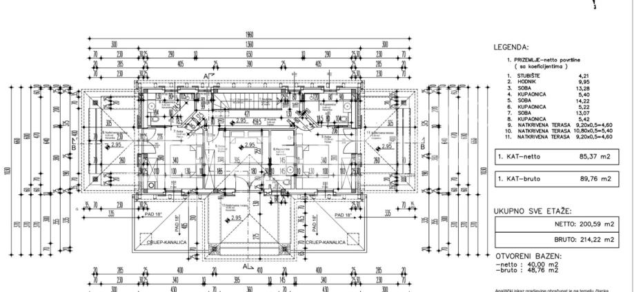 Kuća je ukupne površine 215 m2 a proteže se na dva kata a ima i vanjsku ljetna kuhinju od 50 m2.