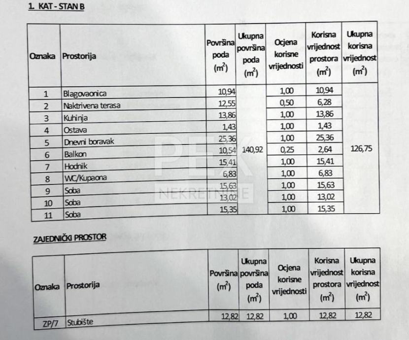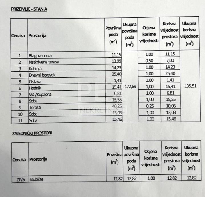 Stan u prizemlju je površine 135,51m2, stan na 1. katu je površine 126,75m2, dok je stan na 2. katu površine 128,48m2.