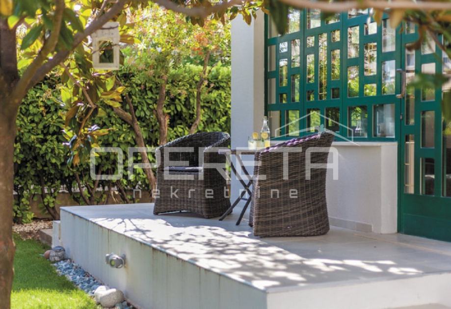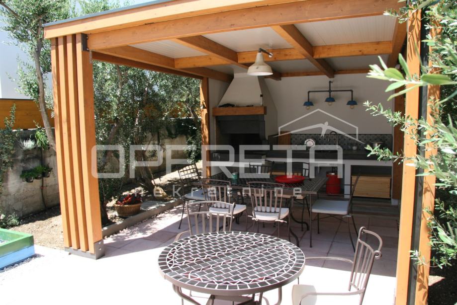 Okućnica je prostrana i pažljivo uređena, s velikim travnjakom, mediteranskim biljem i vanjskim kaminom koji čini središte zone za druženje. Postoji mogućnost ugradnje bazena, čime bi vila dodatno dobila na vrijednosti i turističkoj atraktivnosti.