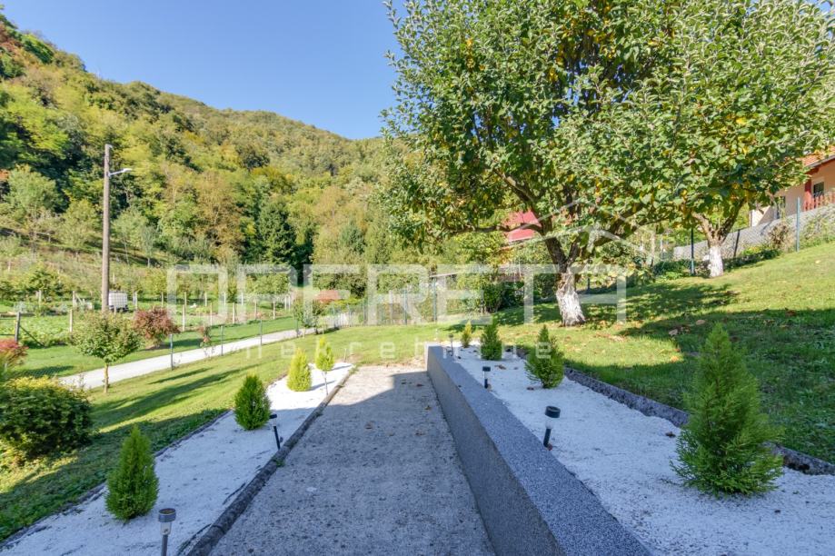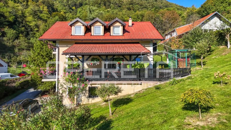 Samostojeća kvalitetno građena i opremljena katnica stambene površine od 180 m2 na blago uzvišenoj i ograđenoj parceli od 946 m2 u mirnoj ulici, odmaknutoj od glavne ceste i centra Klanjca svega 3 minute vožnje. Podijeljena u dvije zasebne samostalne funkcionalne jedinice. Orjentirana na sve 4 strane svijeta, sastoji se od suterenskog dijela ( u kojem su dvije garaže i spremište ), kata i potkrovlja. Na katu se nalazi prostran "open space" dnevni boravak s blagovaonicom i kuhinjom te izlazom na prostranu terasu s pogledom na zelenilo, 2 spavaće/radne sobe, kupaonica s wc-om i ulazni hodnik. Vanjsko natkriveno stubište povezuje ga s potkrovljem gdje se nalazi "open space" dnevni boravak s kuhinjom i blagovaonicom te izlazom na balkon, 2 spavaće sobe, tehnička prostorija, kupaonica i hodnik. Kuća je obnovljena tj. rekonstruirana 2015. g. kada je napravljena terasa, te obnovljen krov i fasada. U dvorištu uredno održavana hortikultura. Lijep položaj na uzvišenom terenu s pogledom na zelenilo, u blizini svih sadržaja potrebnih za kvalitetan život. Do centra Klanjca i svih potrebnih sadržaja 3 minute, do Zagreba 40 minuta vožnje. Preporuka!