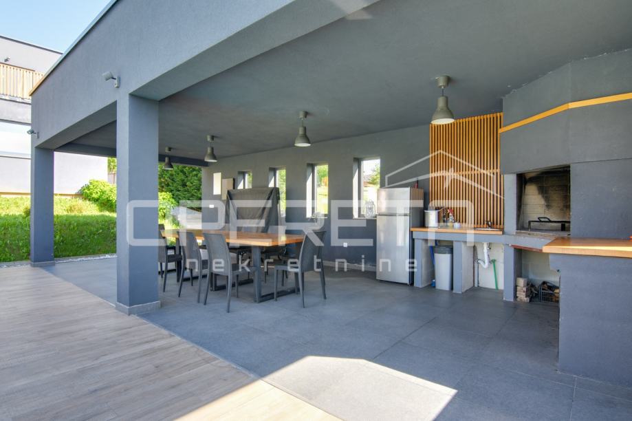 - velika ljetna vanjska kuhinja, natkrivena i poluzatvorena 36m2 sa roštiljem, blagovaonskim stolom za 12 osoba, frižiderom, sudoperom i indukcijskom pločom,