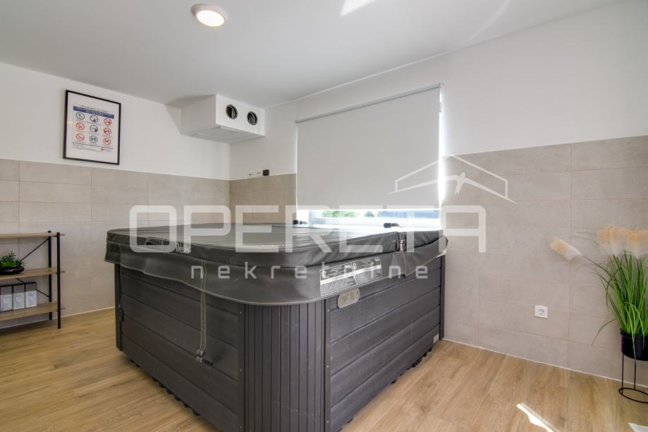 - preljevni, grijani bazen 45m2 s protustrujnim plivanjem i hidromasažnim mlaznicama