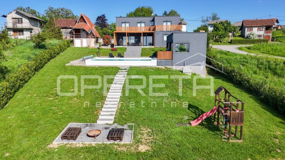 PRODAJA, KUĆA, BAZEN, KLOŠTAR IVANIĆ, 500m2, betonska samostojeća kuća, ima prizemlje i kat. PRIZEMLJE zatvorenog prostora ima 90m2: hodnik, prostrani dnevni boravak s blagovaonicom, potpuno opremljena kuhinja, mali WC i soba (s hidromasažnom kadom). KAT ima zatvorenog prostora 86m2 i to: 3 spavaće sobe s vlastitim kupaonicama s wc-ima, stubište unutarnje, hodnik. Svaka soba ima izlaz na balkon i na terasu (20m2) idealna za opuštanje, razbuđivanje na jutarnjem suncu. U prizemlju iz svake prostorije se može izaći z svakog dijela na sunčanu, veliku terasu od 37m2. Do ove kuće ima još dodatna drvena, autohtona kuća tlocrtne površine 43m2, koja se sastoji od dnevnog boravka s kuhinjom i blagovaonicom, wc-om te spavaćim prostorom na galeriji , natkrivenom terasom od 16m2 i podruma površine 24m2. Ova predivna i jedinstvena nekretnina nudi jošš i :