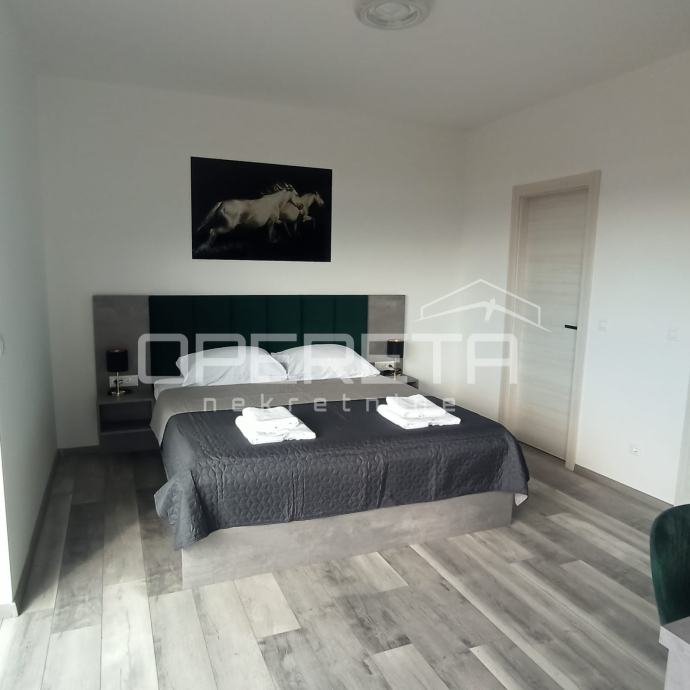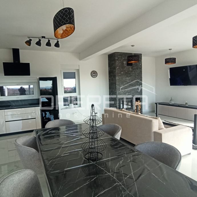 Interijer je osmišljen s naglaskom na udobnost, uz praktičan raspored prostorija i suvremene detalje koji zadovoljavaju potrebe svakodnevnog života. Unutrašnjost uključuje prostrani dnevni boravak, blagovaonicu i prostor predviđen za kuhinju, kao i tri spavaće sobe na katu, svaku s vlastitom kupaonicom. U prizemlju se nalazi i sauna s dodatnim tušem te odvojeni toalet za goste, što dodatno pridonosi udobnosti i promišljenom rasporedu prostora.