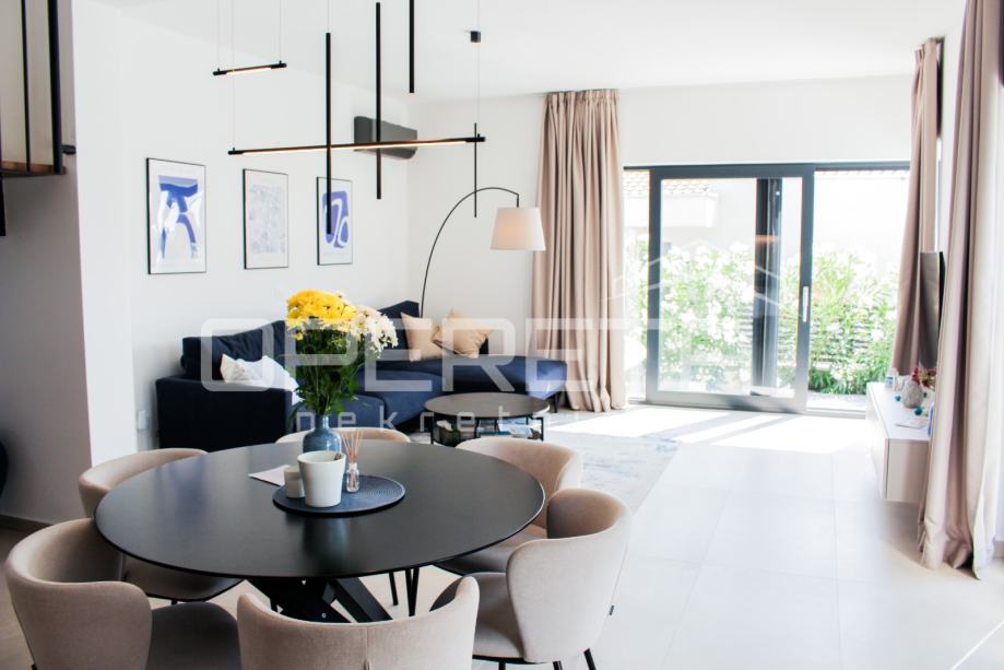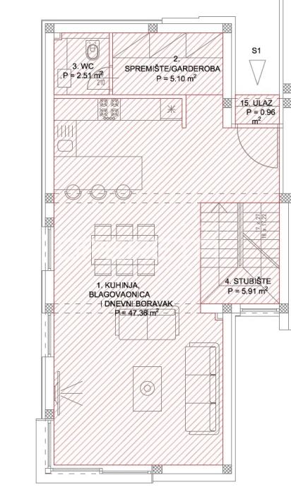 Prizemlje nudi elegantan dnevni prostor otvorenog koncepta – moderno opremljenu kuhinju, blagovaonicu i raskošno uređeni dnevni boravak. Tu su i gostinjski toalet te diskretno smješteno spremište.