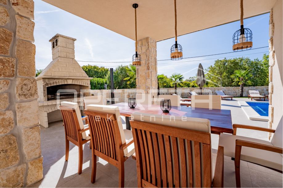Prizemlje: otvoreni dnevni boravak s blagovaonicom i potpuno opremljenom kuhinjom, koji se prirodno nadovezuje na prostranu natkrivenu terasu s pogledom na bazen i vrt. Tu se nalaze i jedna spavaća soba s vlastitom kupaonicom te gostinjski toalet.