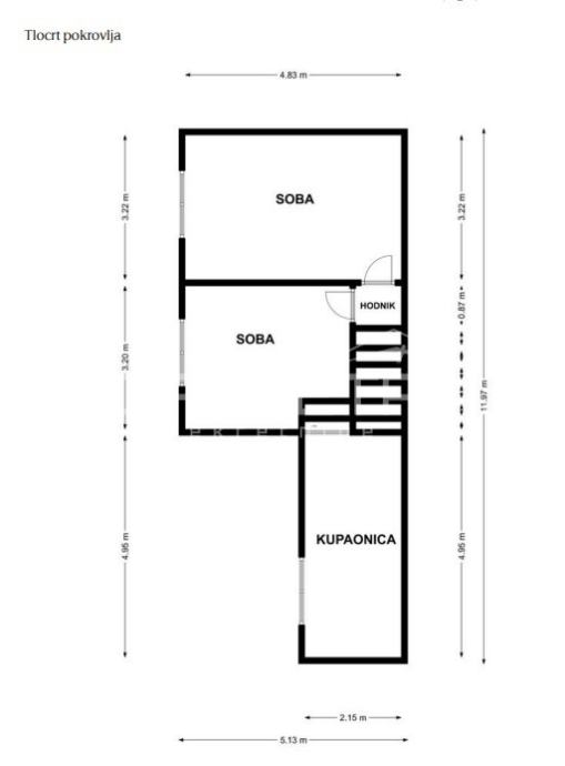 • Potkrovlje (36,18 m2): dvije sobe, hodnik i kupaonica, mogućnost dodatnog uređenja.