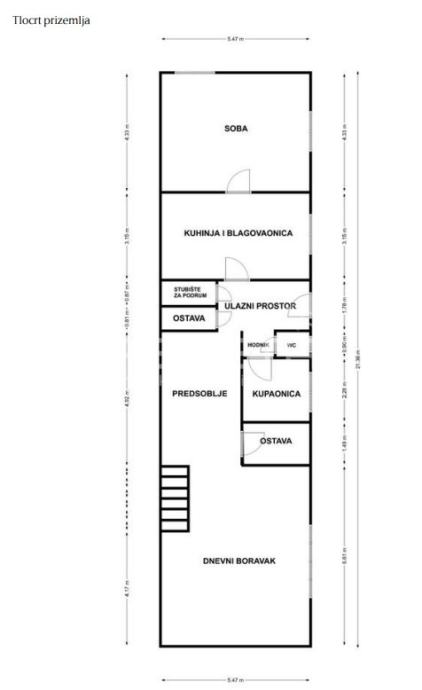 • Podrum (24,11 m2): dvije prostorije povezane unutarnjim stepeništem, idealne za vinski podrum, vešeraj ili spremište.