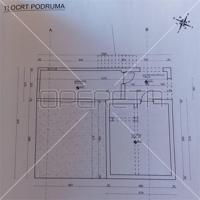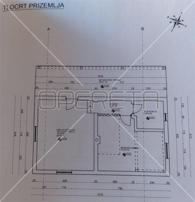 U prizemlju se nalazi ulazni hodnik, kuhinja sa blagovaonicom, kupaonica sa wc-om, spavaća soba te natkrivena terasa.