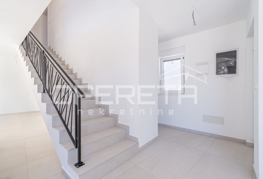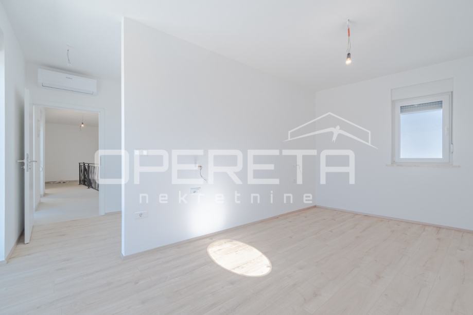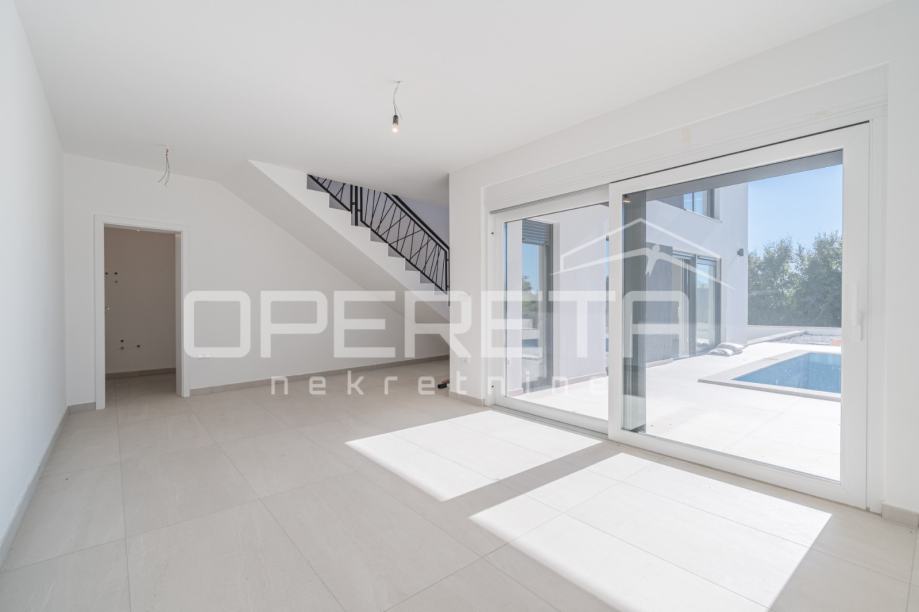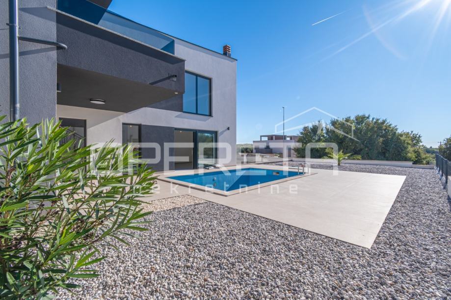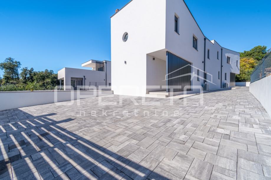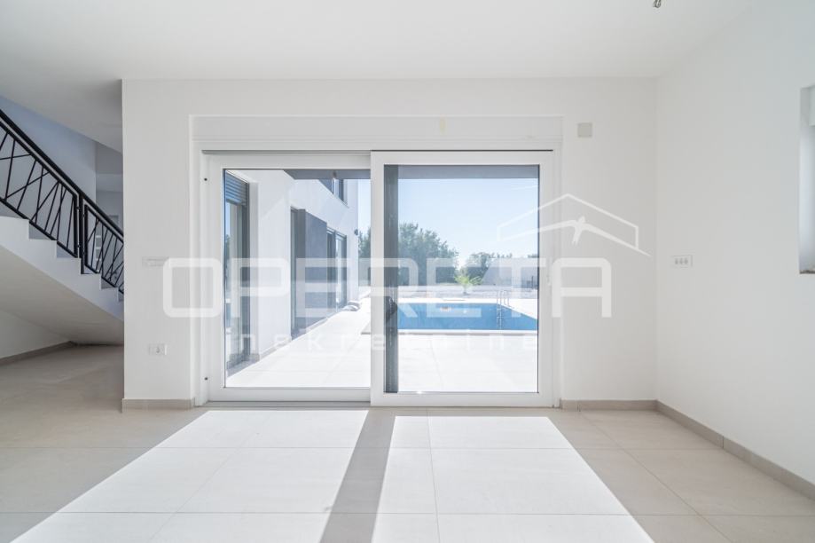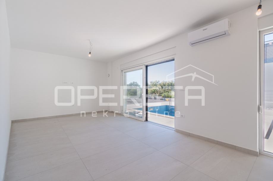 Kuća je orijentirana prema jugu, s ravnim krovom. Stolarija je PVC, s troslojnim staklima i električnim podizačima. Sve prostorije osim soba su obložene pločicama, a postavljene su 4 klima uređaja (u svakoj sobi i dnevnom boravku). Okućnica uključuje bazen veličine 28 m2 (7x4 m), idealan za uživanje u toplim ljetnim danima, vrt i parkirna mjesta.