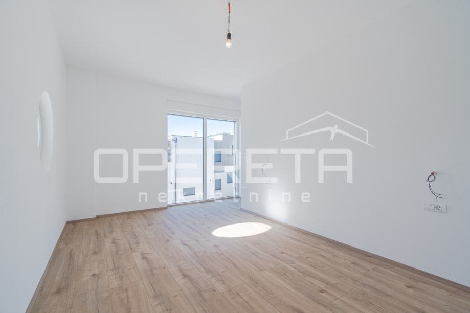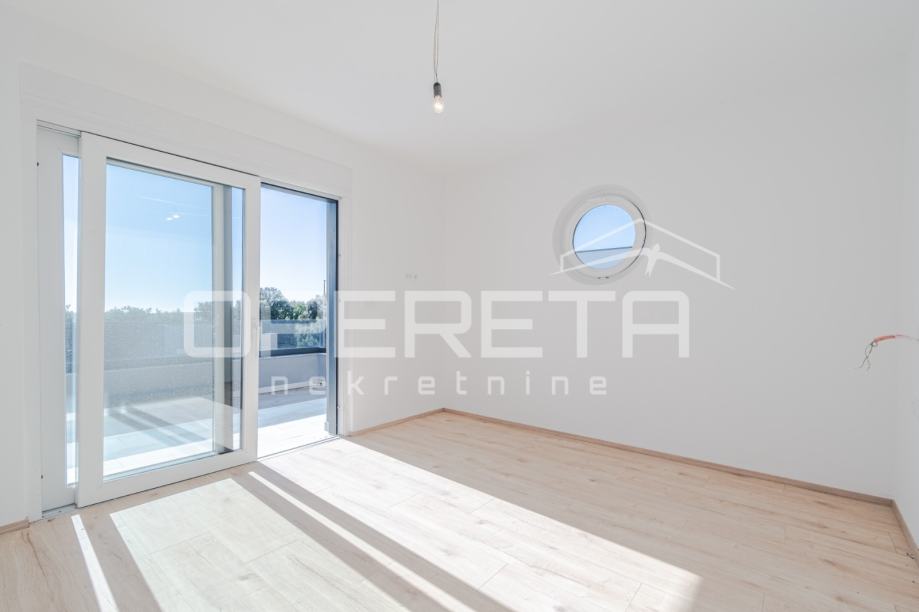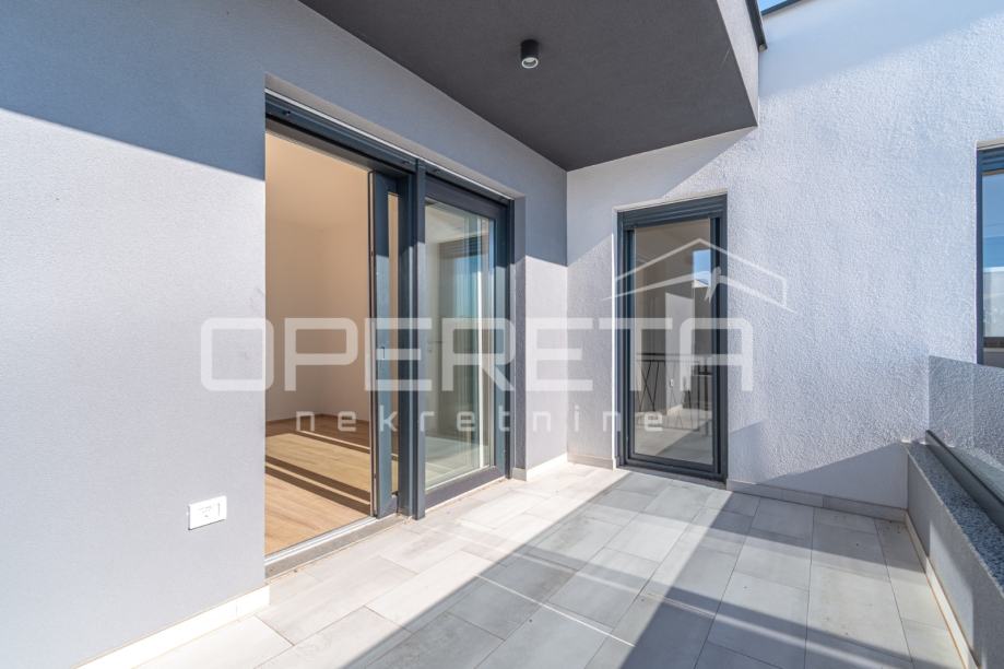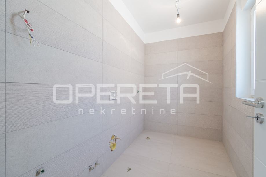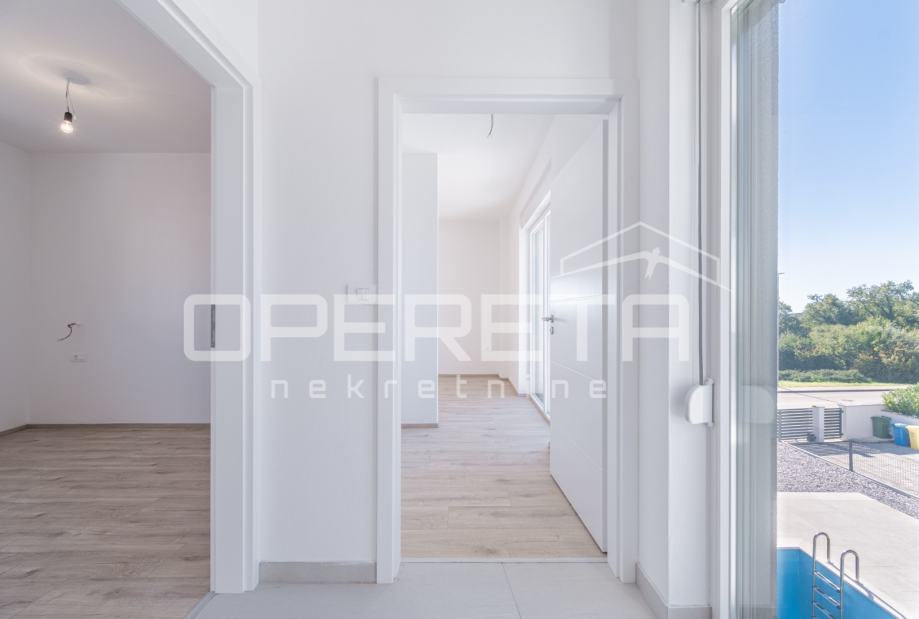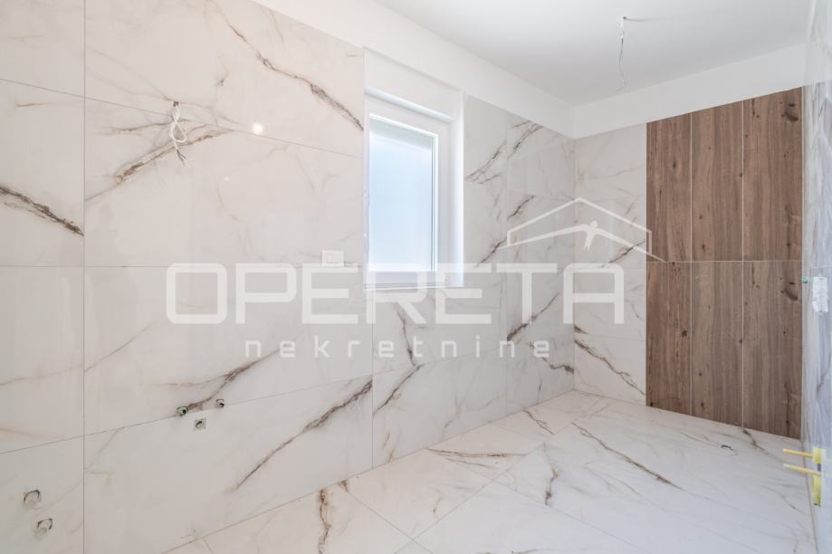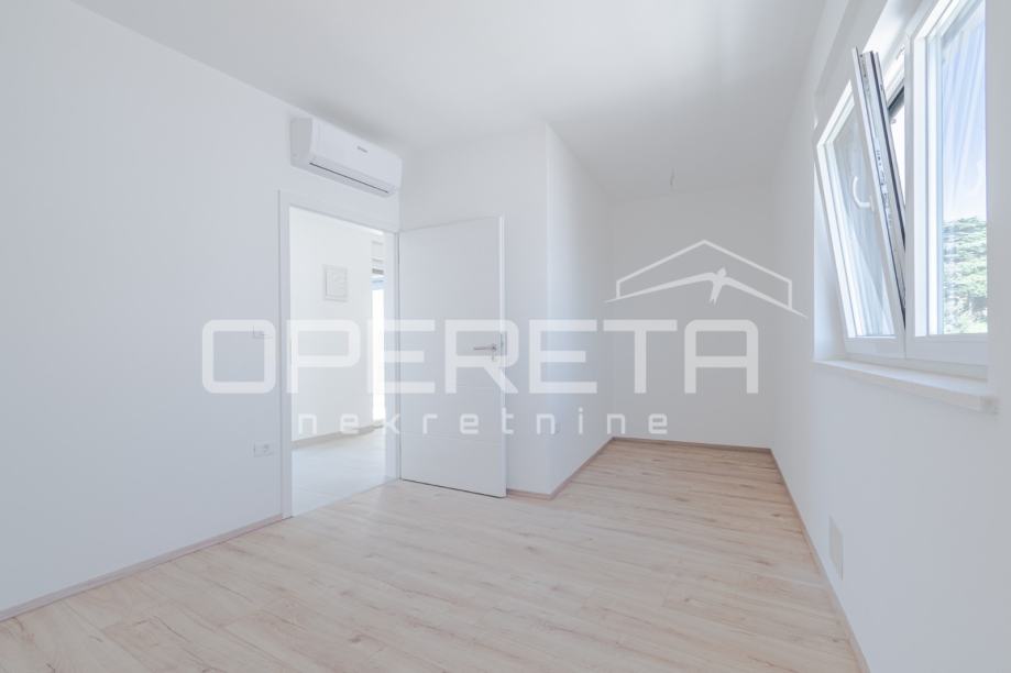 Kuća je orijentirana prema jugu, s ravnim krovom. Stolarija je PVC, s troslojnim staklima i električnim podizačima. Sve prostorije osim soba su obložene pločicama, a postavljene su 4 klima uređaja (u svakoj sobi i dnevnom boravku). Okućnica uključuje bazen veličine 28 m2 (7x4 m), idealan za uživanje u toplim ljetnim danima, vrt i parkirna mjesta.