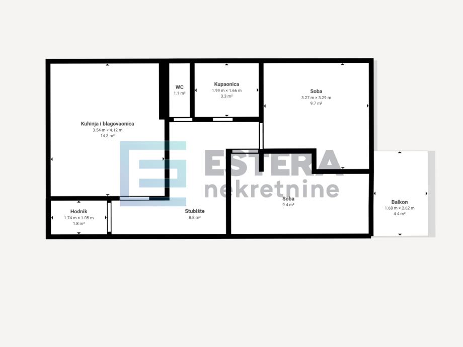 - 1. kata koji se sastoji od spavaće sobe, dječje/radne sobe s balkonom, kupaonice, wc-a posebno, i hodnika