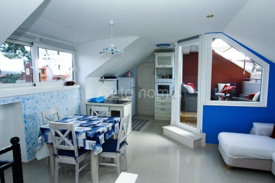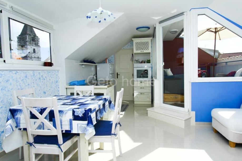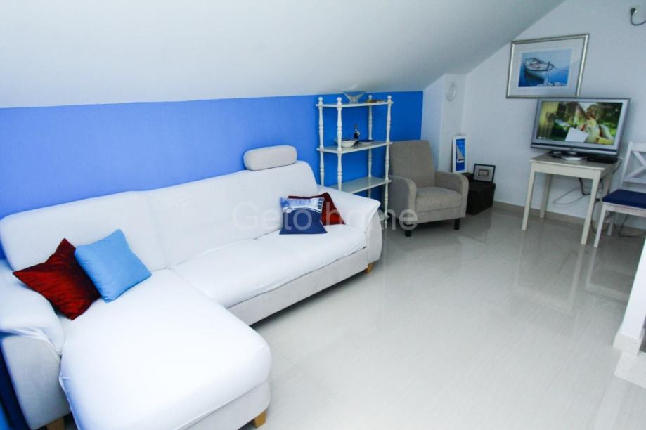U prizemlju se nalazi dvosoban stan (dnevni boravak, kuhinja, kupaona, spavaća soba i terasa).Na prvom katu se nalaze hodnik, dvije spavaće sobe i kupaona.Drugi kat se sastoji od velikog open space prostora koji uključuje dnevni boravak, kuhinju i spremište, kao i balkon sa prekrasnim pogledom na more.