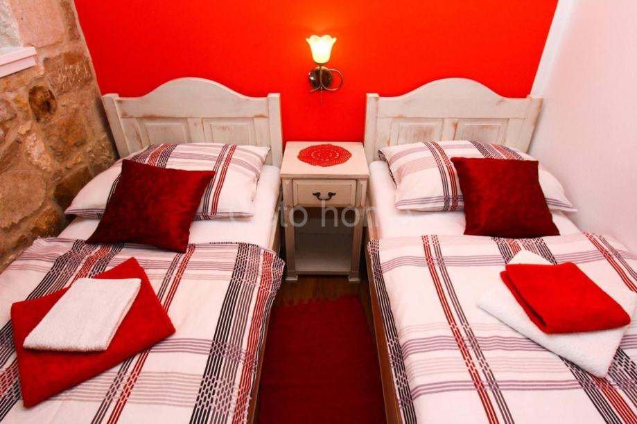 Kuća je adaptirana, uređenje je u dalmatinskom stilu, a kamen na kući je obrađen ručno i detaljno uz puno truda i vremena. Namještaj je izrađen od punog drveta.