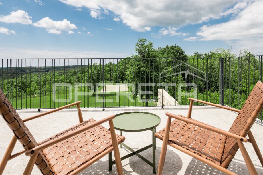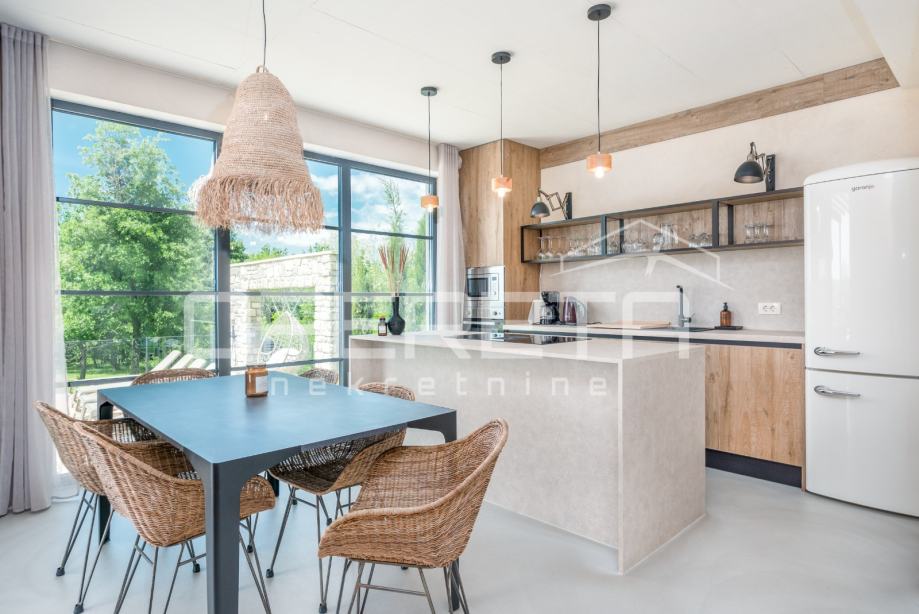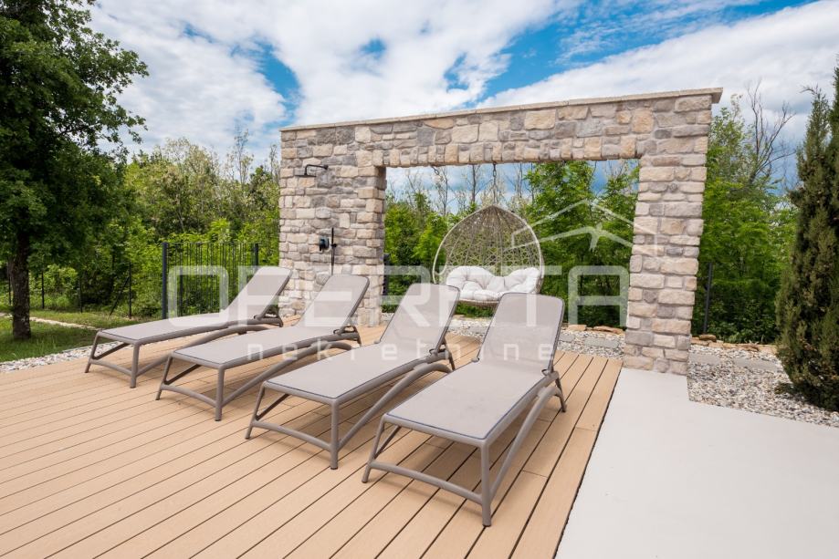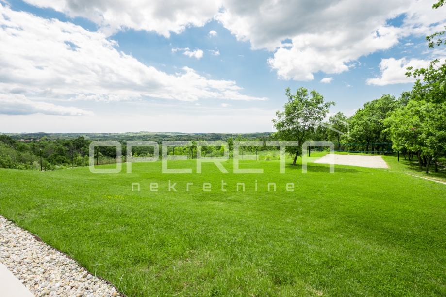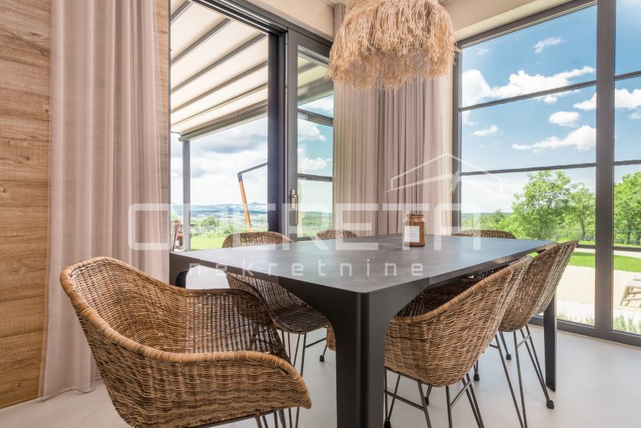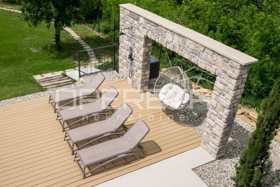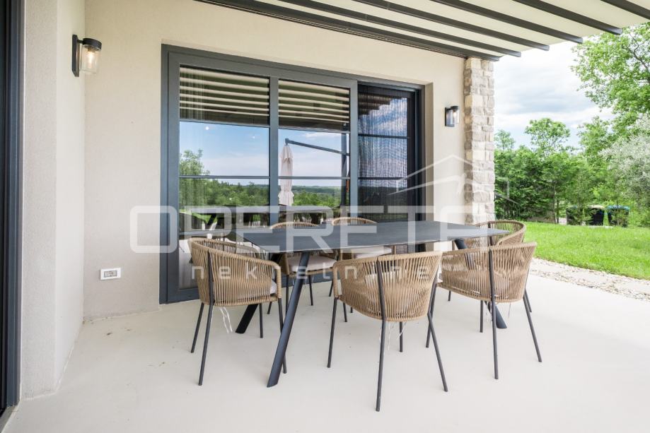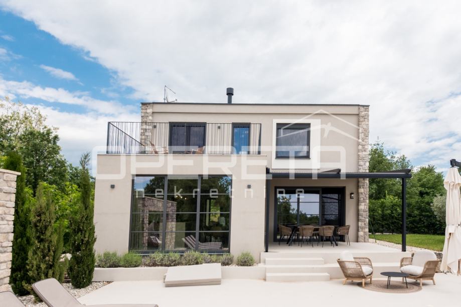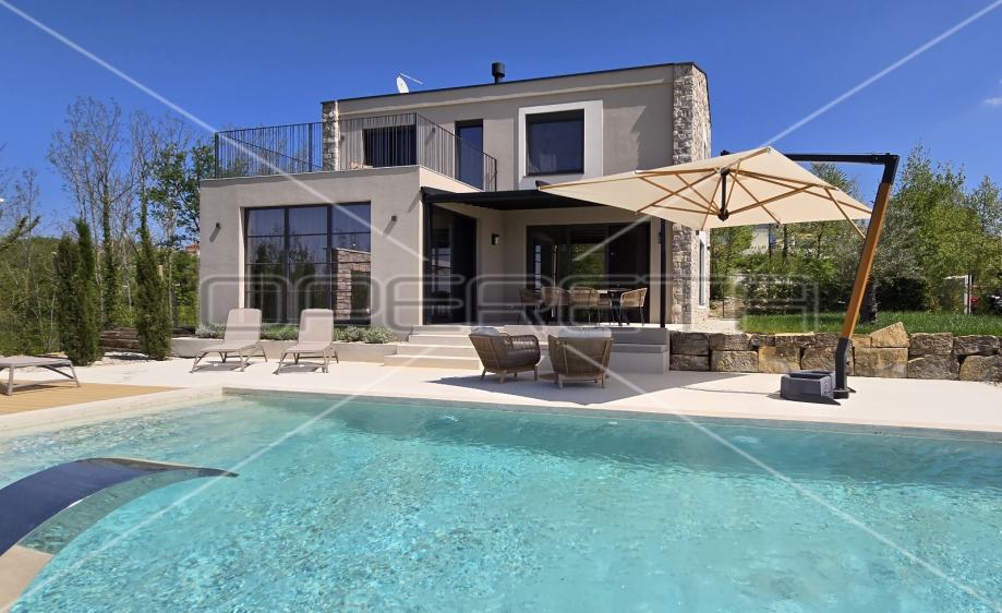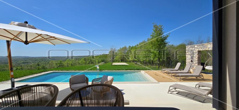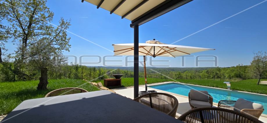 Prodaje se novosagrađena i kompletno novouređena vila s grijanim bazenom i igralištem za odbojku na parceli od 2000m2 u okolici Karojbe ( 10 min od Motovuna ). Kuća se sastoji od prizemlja; dnevni boravak, kuhinja s ostavom, blagovaonica i kupaonica te natkrivena terasa i kata; dvije spavaće sobe od kojih svaka ima svoju kupaonicu te terase sa koje se pruža pogled na more i Motovun. Mogućnost dobivanja dodatne sobe.. Nekretnina je zadnja u građevinskoj zoni i okružena je zelenom zonom gdje nema mogućnosti gradnje.