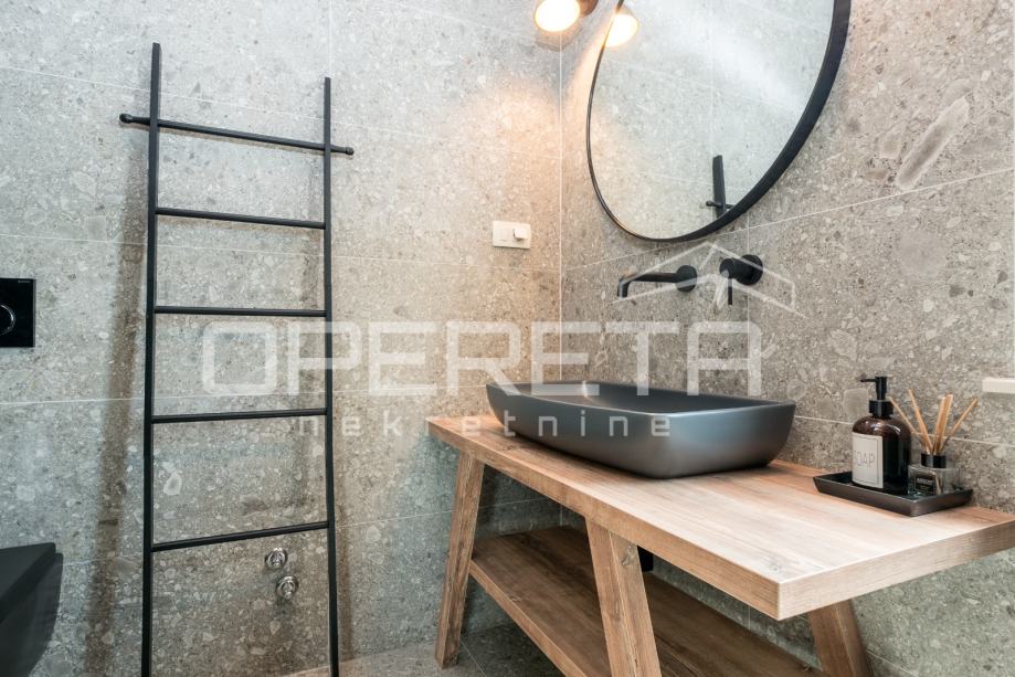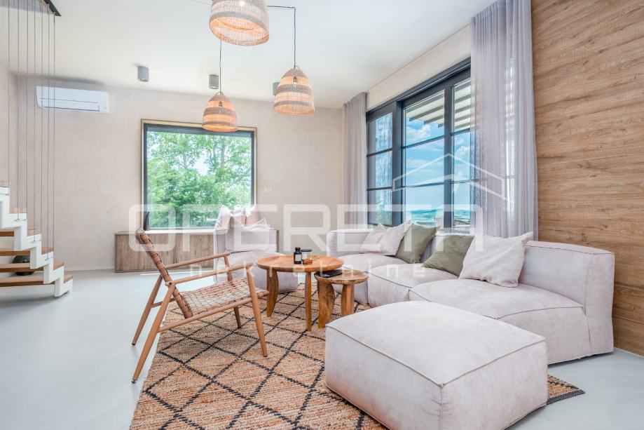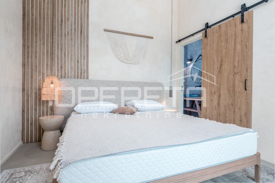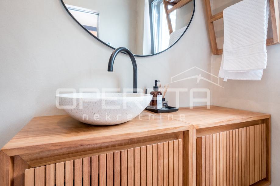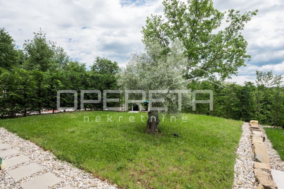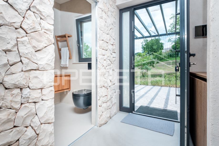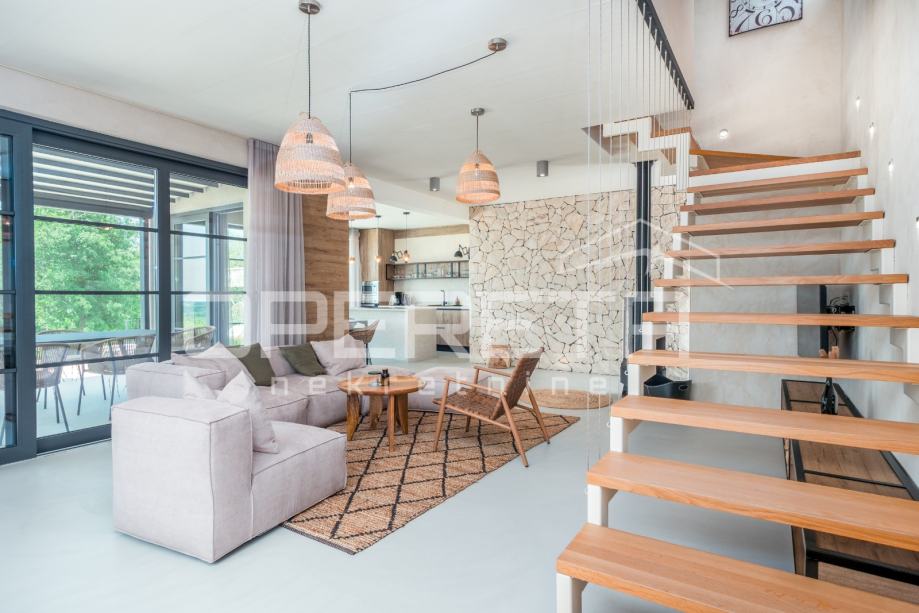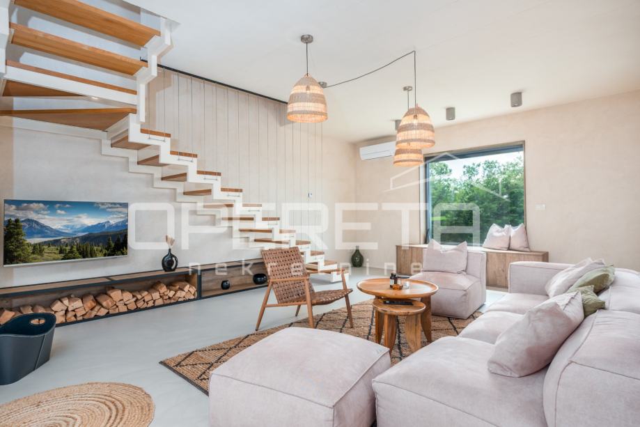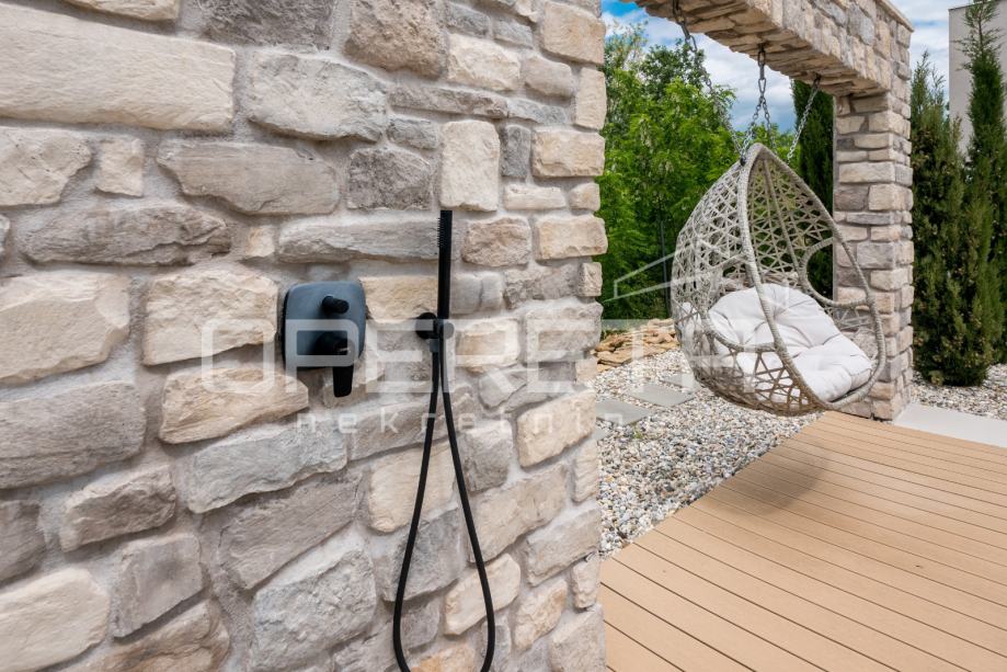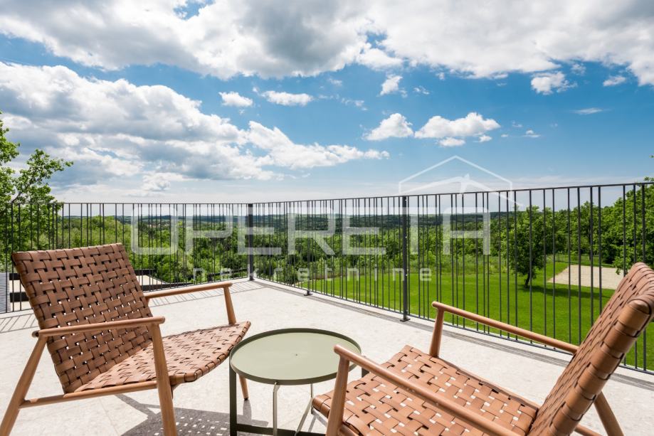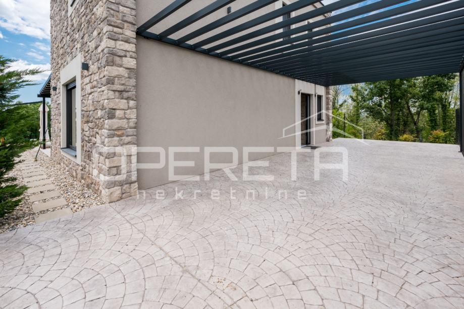 Prodaje se novosagrađena i kompletno novouređena vila s grijanim bazenom i igralištem za odbojku na parceli od 2000m2 u okolici Karojbe ( 10 min od Motovuna ). Kuća se sastoji od prizemlja; dnevni boravak, kuhinja s ostavom, blagovaonica i kupaonica te natkrivena terasa i kata; dvije spavaće sobe od kojih svaka ima svoju kupaonicu te terase sa koje se pruža pogled na more i Motovun. Mogućnost dobivanja dodatne sobe.. Nekretnina je zadnja u građevinskoj zoni i okružena je zelenom zonom gdje nema mogućnosti gradnje.